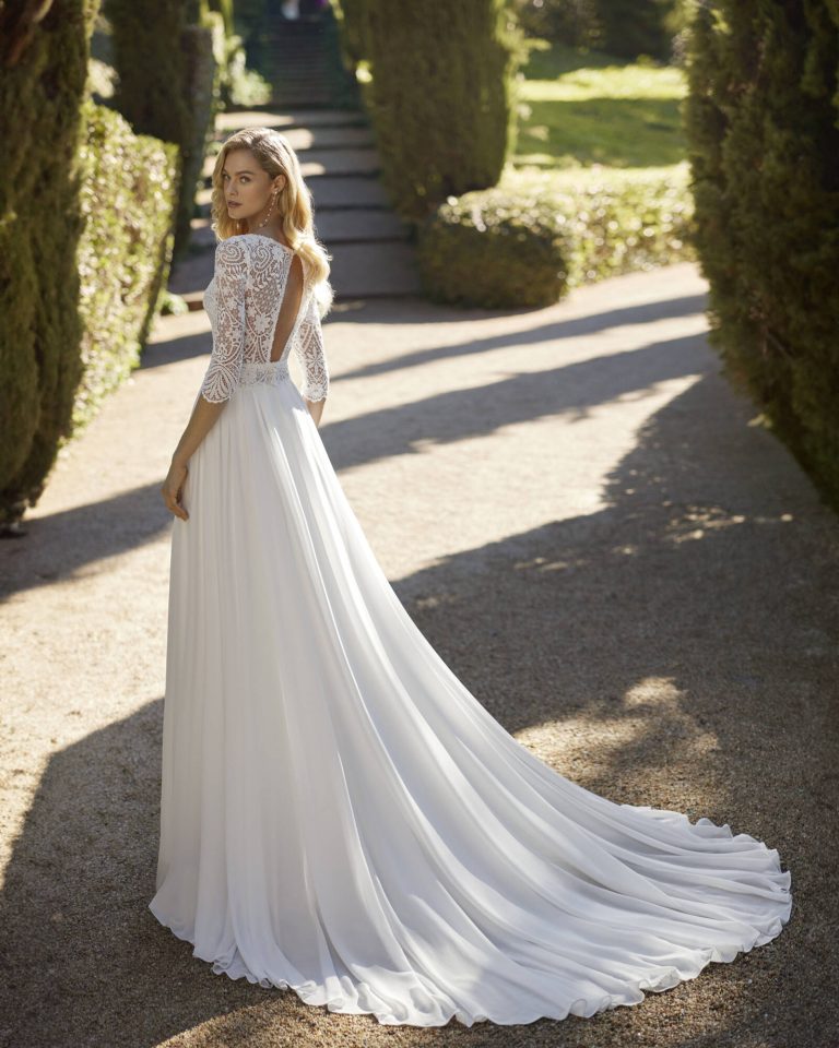 Abito da sposa realizzato in georgette e pizzo. Goditi uno scollo profondo, una schiena scoperta, maniche alla francese e una gonna con spacco laterale. Un abito da sposa di Adriana Alier.