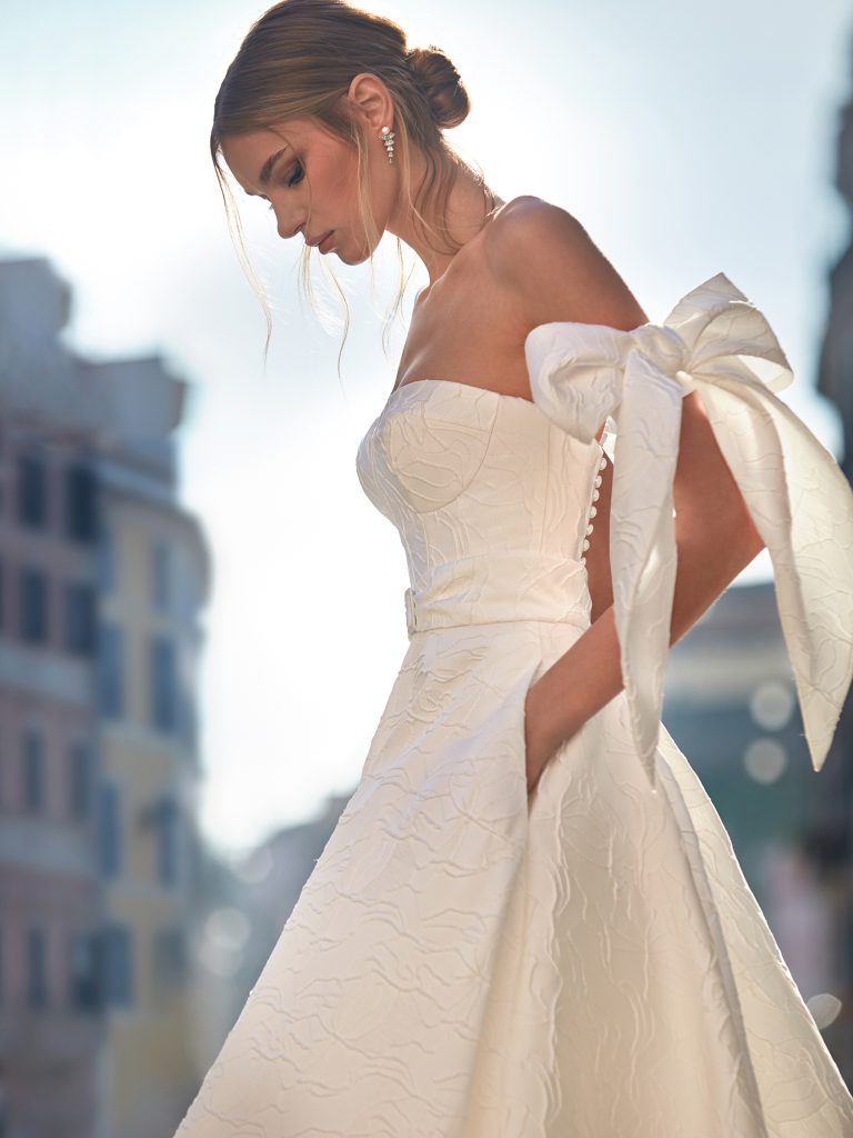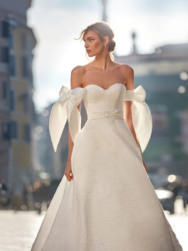 Meraviglioso abito da sposa principesco in jaquard goffrato. La texture del tessuto crea un ricamo minimal e moderno mentre la scollatura a cuore moderna e le maniche staccabili con fiocchi aggiungono un romanticismo da sogno.