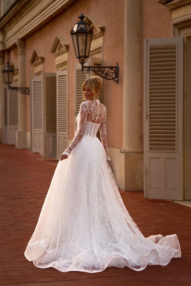 Un abito da sposa dalla presenza scenica impareggiabile, in cui il fascino della scollatura alta in pizzo rebrodé e delle maniche lunghe trasparenti si unisce alla sensualità di un corpetto steccato, leggermente a cuore. La gonna ampia con strascico e sovrapposizione di pizzo francese regala volume e leggerezza, perfetta per una sposa che desidera stupire con grazia senza tempo.