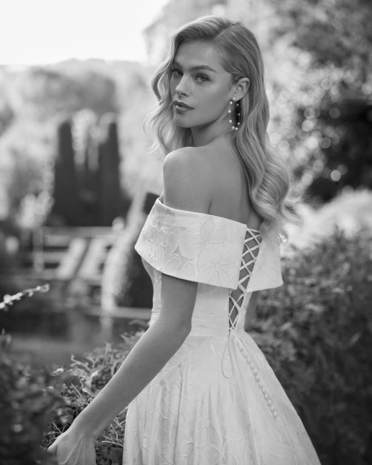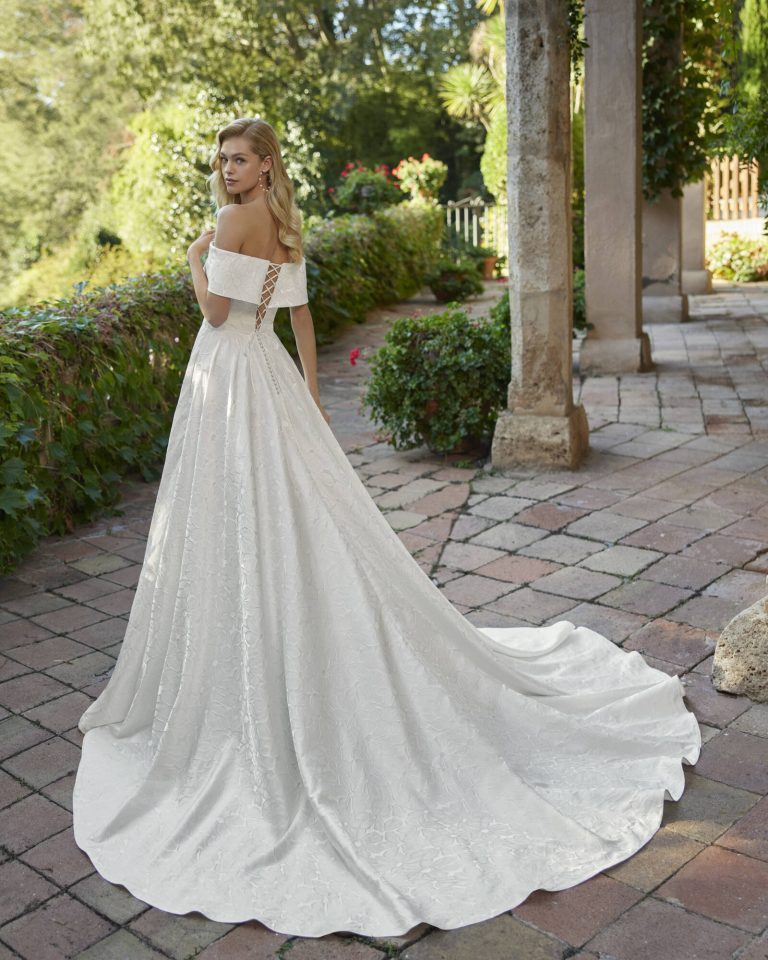 Abito da sposa a trapezio, pensato appositamente per una sposa dall’animo romantico. Il modello Dolma è realizzato in tessuto broccato pregiato. Un abito esclusivo di Adriana Alier.