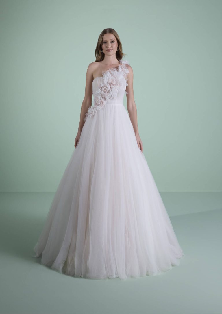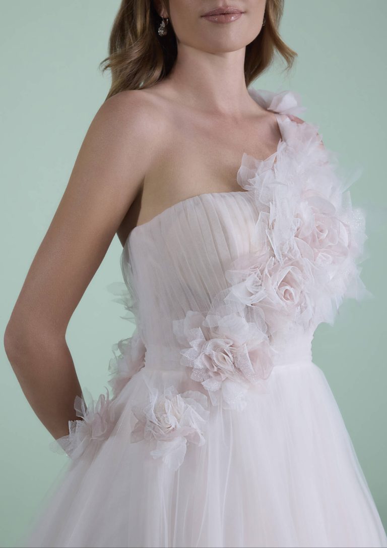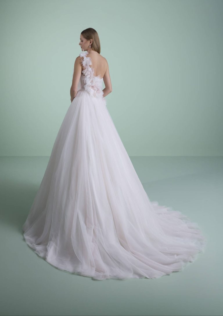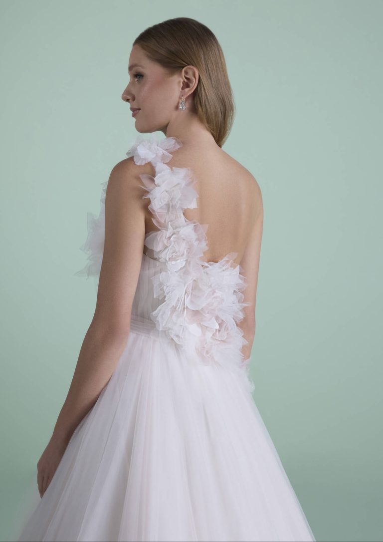Abito da sposa realizzato in tulle light pink e fiori. Il modello Dorinca è poesia, è romanticismo allo stato puro.
