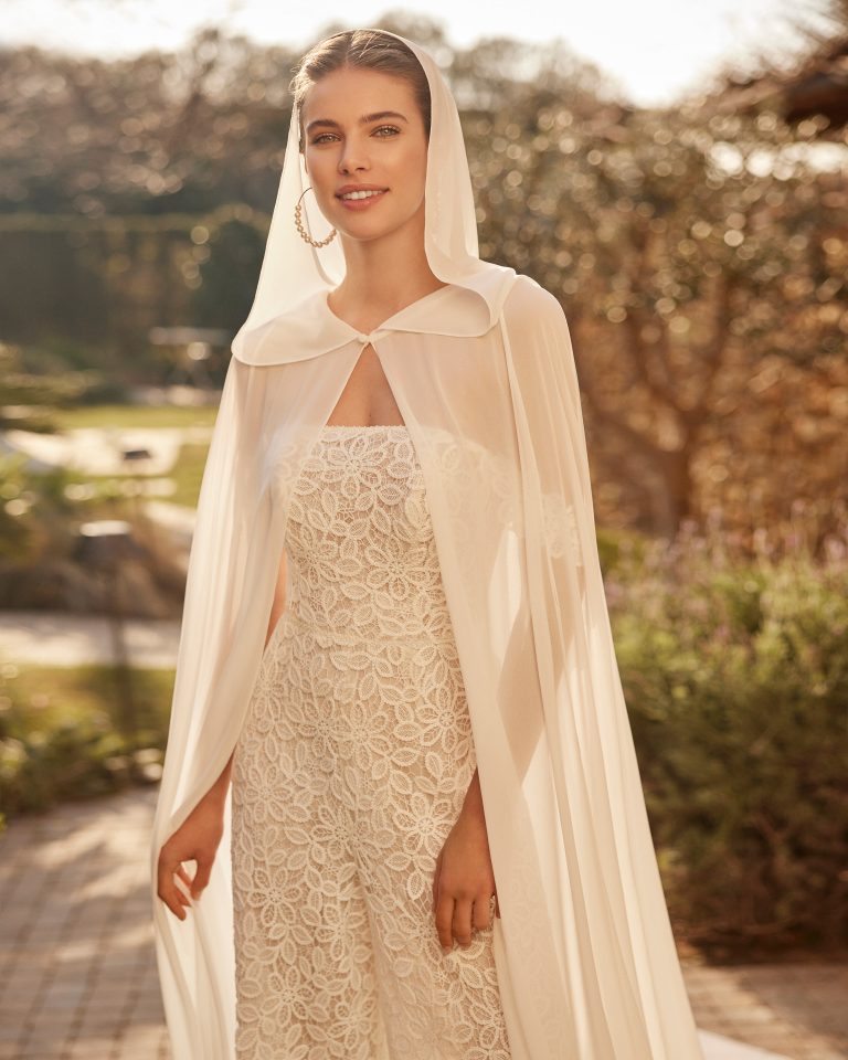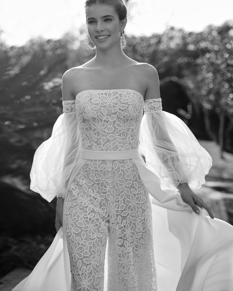 Modernissima tuta pantalone da sposa confezionata in guipure, con dolce scollo e corpetto senza spalline, maniche e sopragonna staccabili in crêpe, questo è un abito da sogno della linea Rosa Clará Boheme.