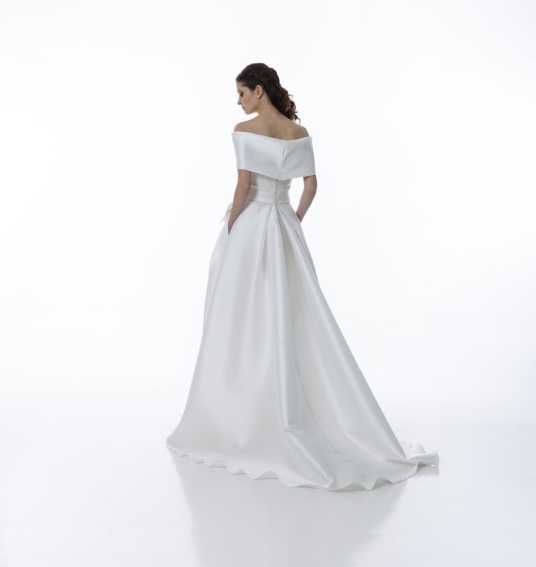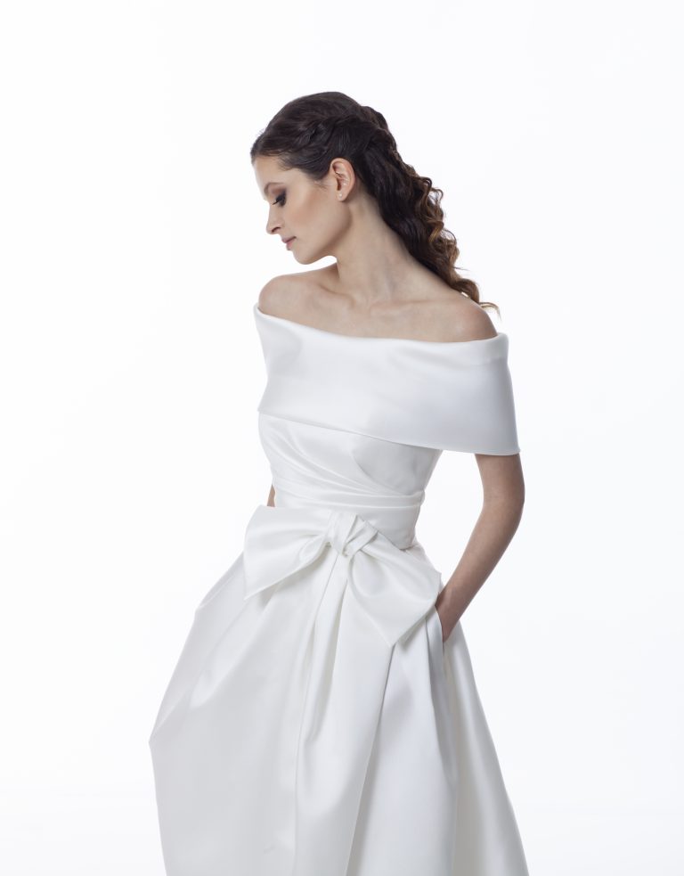Abito da sposa in mikado con corpetto a fascia e maxi fiocco in vita. La gonna ampia con spacco dona eleganza e modernità a un look raffinato e senza tempo.