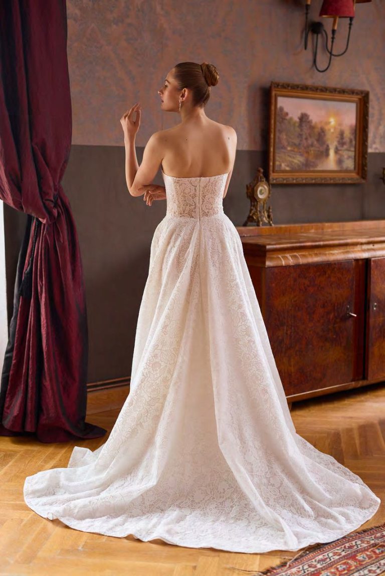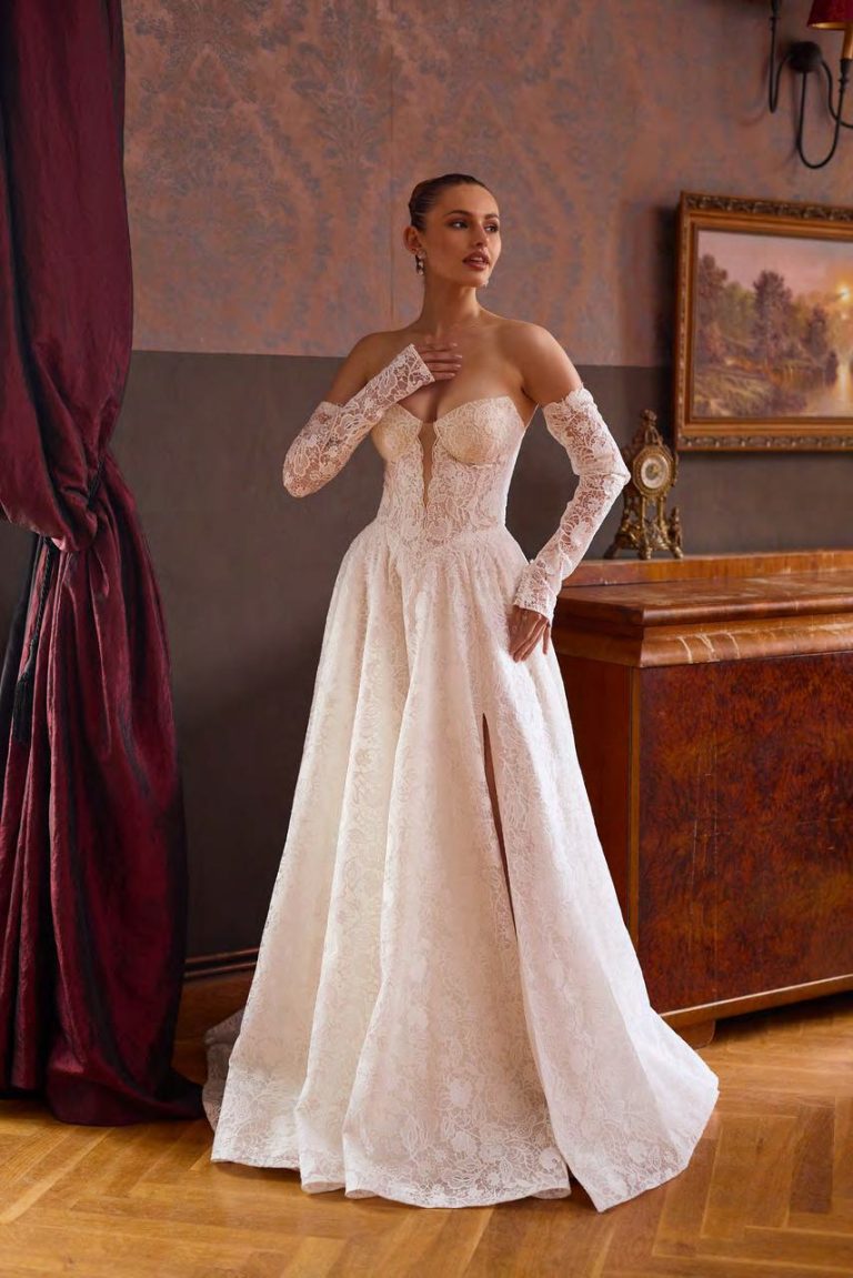 Un abito da sposa che incarna femminilità e fascino senza tempo: Edwina conquista con un bustier a cuore profondo, impreziosito da un raffinato bordo smerlato e steccature a vista che scolpiscono la silhouette. La gonna, ampia ma leggera, è movimentata da un profondo spacco laterale che regala un twist moderno e seducente. Il pizzo all-over avvolge ogni dettaglio, compresi i guanti coordinati rimovibili, per un look bridal dalla classe inconfondibile.