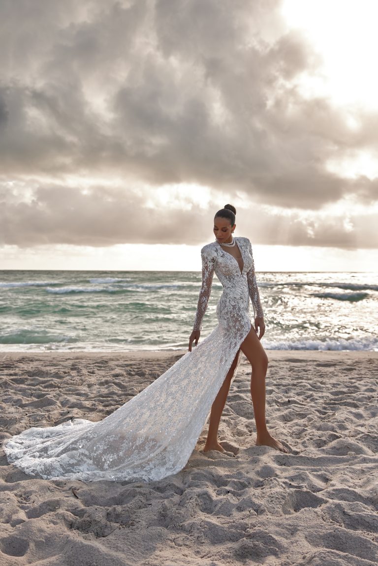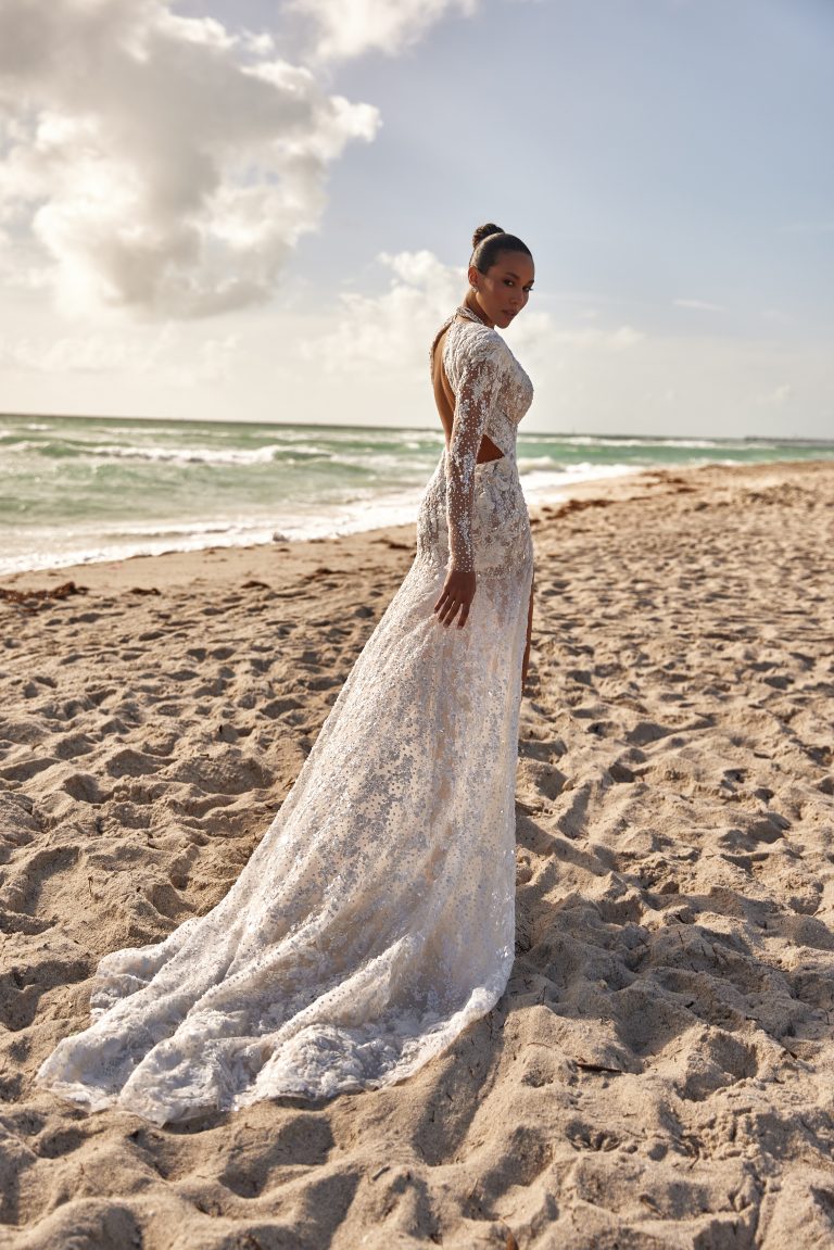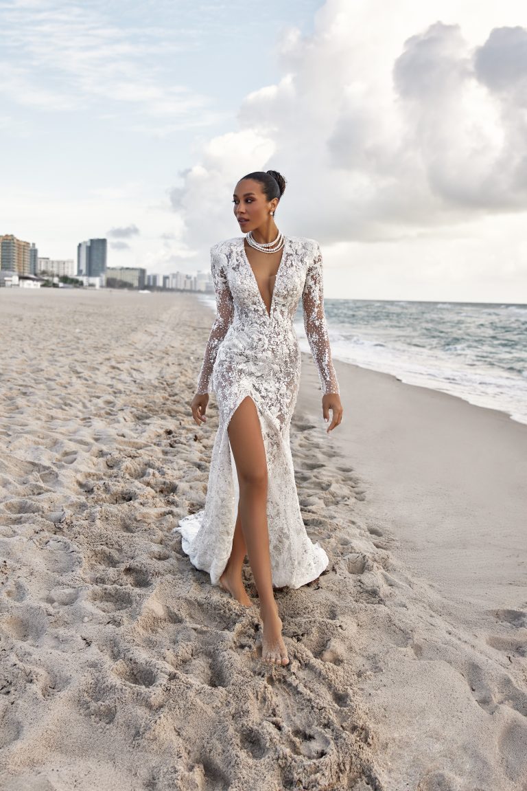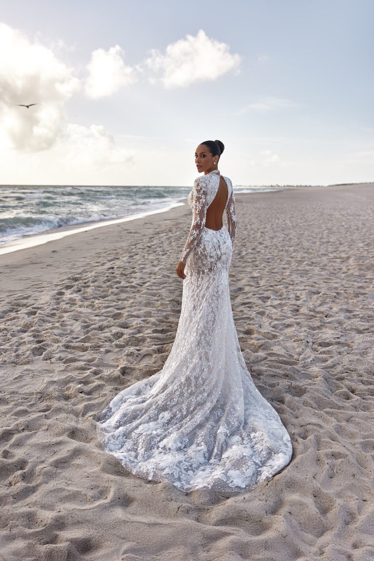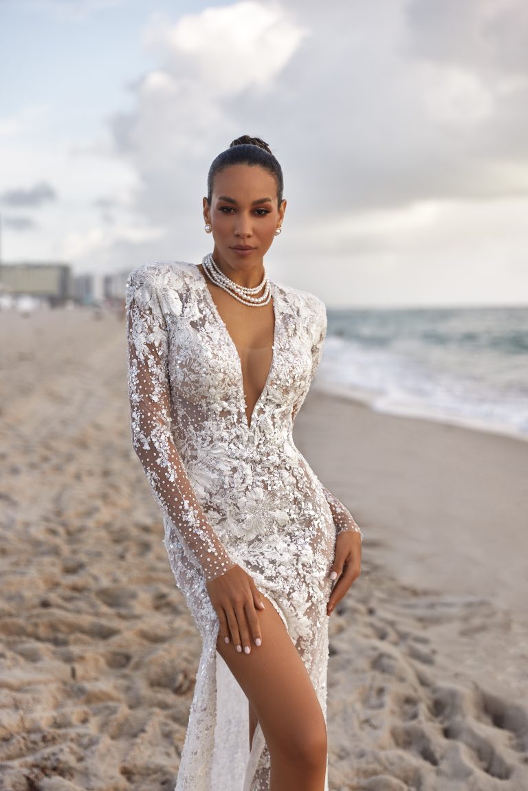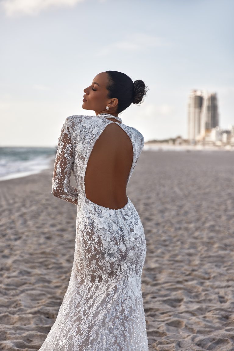 Eliana è l’incarnazione della sensualità sofisticata. Le spalle scolpite, l’audace spacco e il pizzo luminoso si fondono in un design che sprigiona potere e femminilità. Il corpetto velato, impreziosito da ricami scintillanti, avvolge la pelle in un bagliore radioso, mentre lo scollo sulla schiena dona carattere ed eleganza. Perfetto per la sposa decisa e magnetica, Eliana è un abito da sposa che lascia un ricordo indelebile a ogni passo.