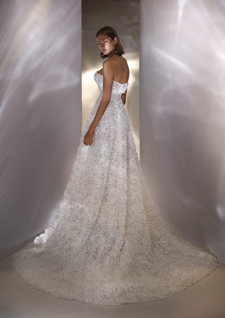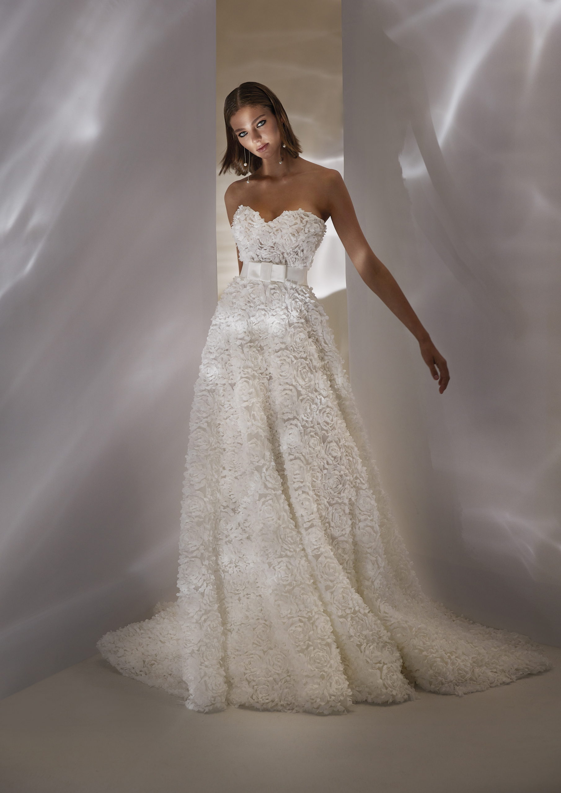 Modello A line senza spalline in pizzo con texture tridimensionale. Corpetto senza maniche con punto vita naturale arricchito da un simpatico fiocco, gonna che esalta le forme ed elegante strascico.