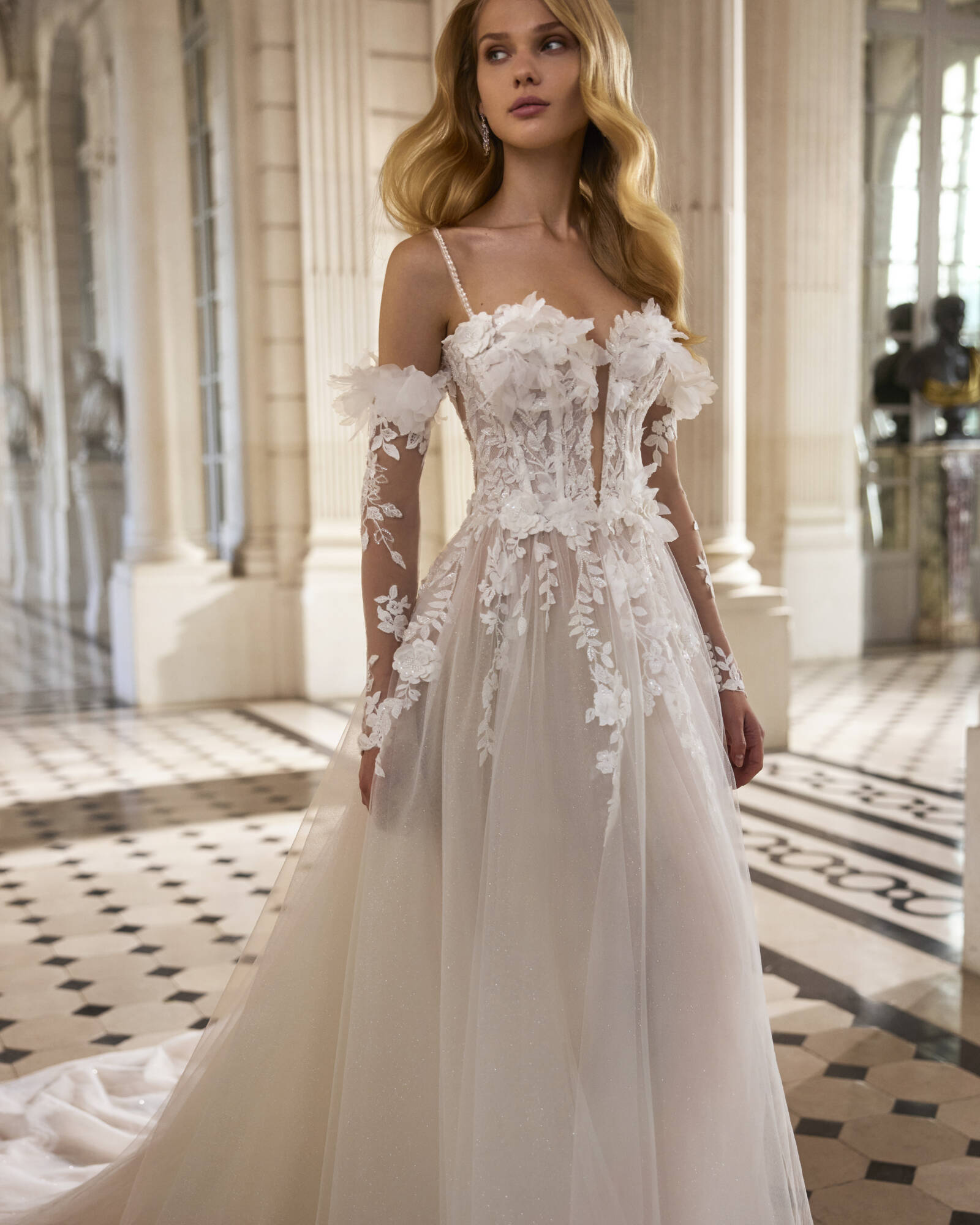 Romantico abito da sposa dal taglio dritto realizzato in pizzo con gonna in tulle. Il corpetto è delicatamente sexy e presenta maniche rimovibili, lo scollo è profondo, impreziosito da un fiore decorativo, la gonna con spacco laterale da un tocco di modernità al vestito.