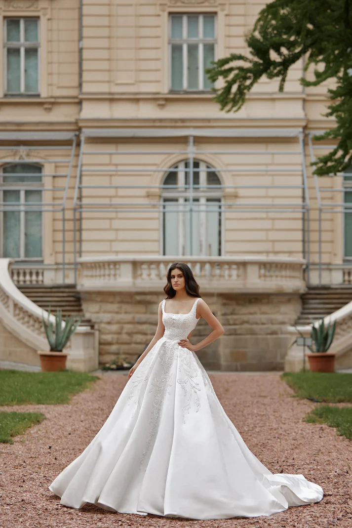 Uno splendido abito da sposa interamente realizzato in raso con dettagli in pizzo. gonna a pieghe e strascico a cattedrale.