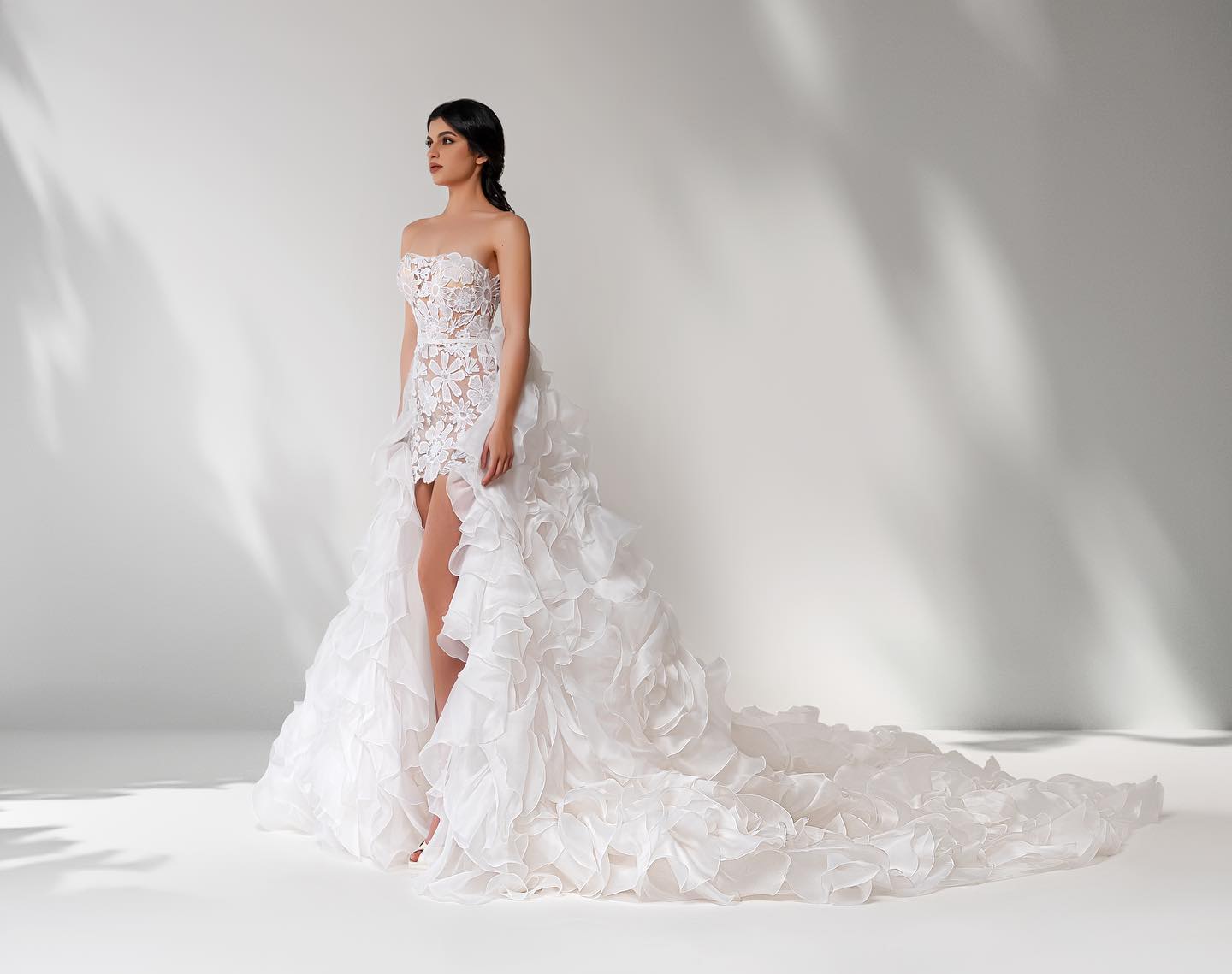 Abito da sposa haute couture con corpetto gioiello e gonna in organza effetto nuvola. Lo spacco frontale e lo strascico scenografico rendono questo modello una vera opera d’arte per la sposa che sogna un ingresso indimenticabile.