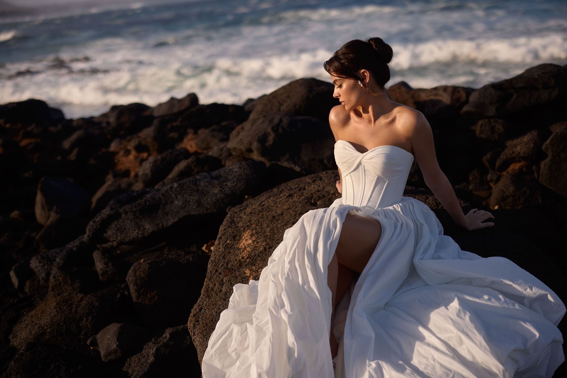 Fleur: raffinato abito da sposa a trapezio senza spalline con corpetto scolpito a corsetto, impreziosito da un morbido drappeggio e stecche verticali per una vestibilità impeccabile. L’abito include maniche a spalle scoperte staccabili. La gonna voluminosa scende elegantemente dalla vita, con delicate pieghe e un ampio strascico.