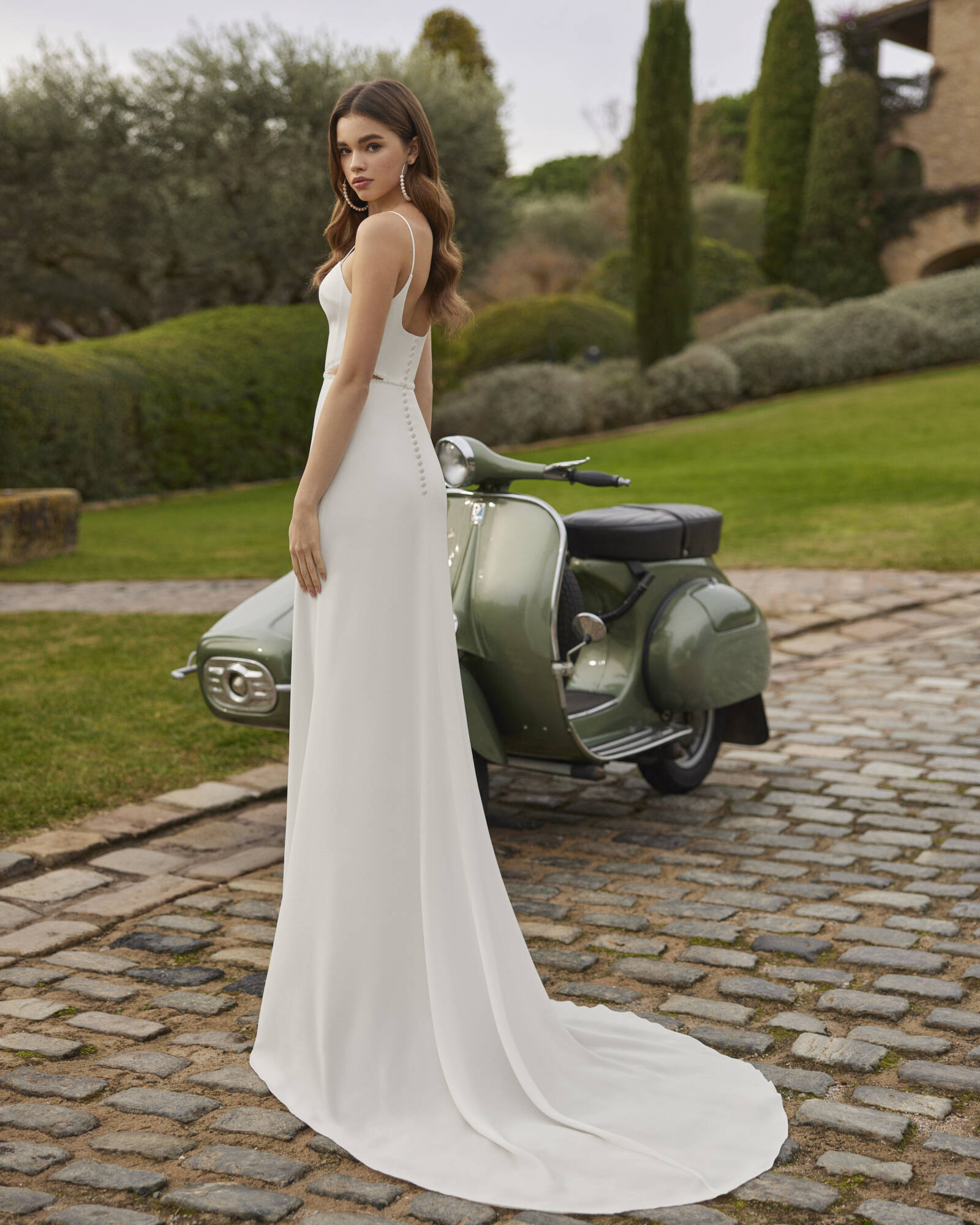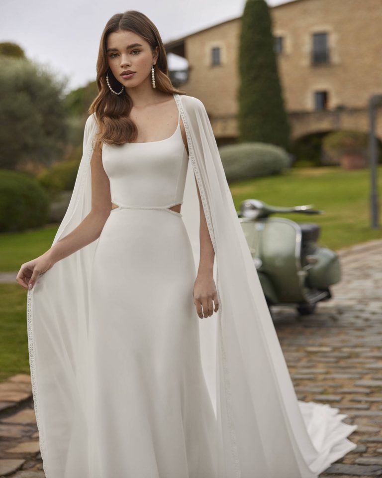 Abito da sposa dal taglio dritto in stile semplice e fluido. Realizzato in crêpe, con scollo quadrato sul davanti e schiena chiusa da un’abbottonatura e spalline.