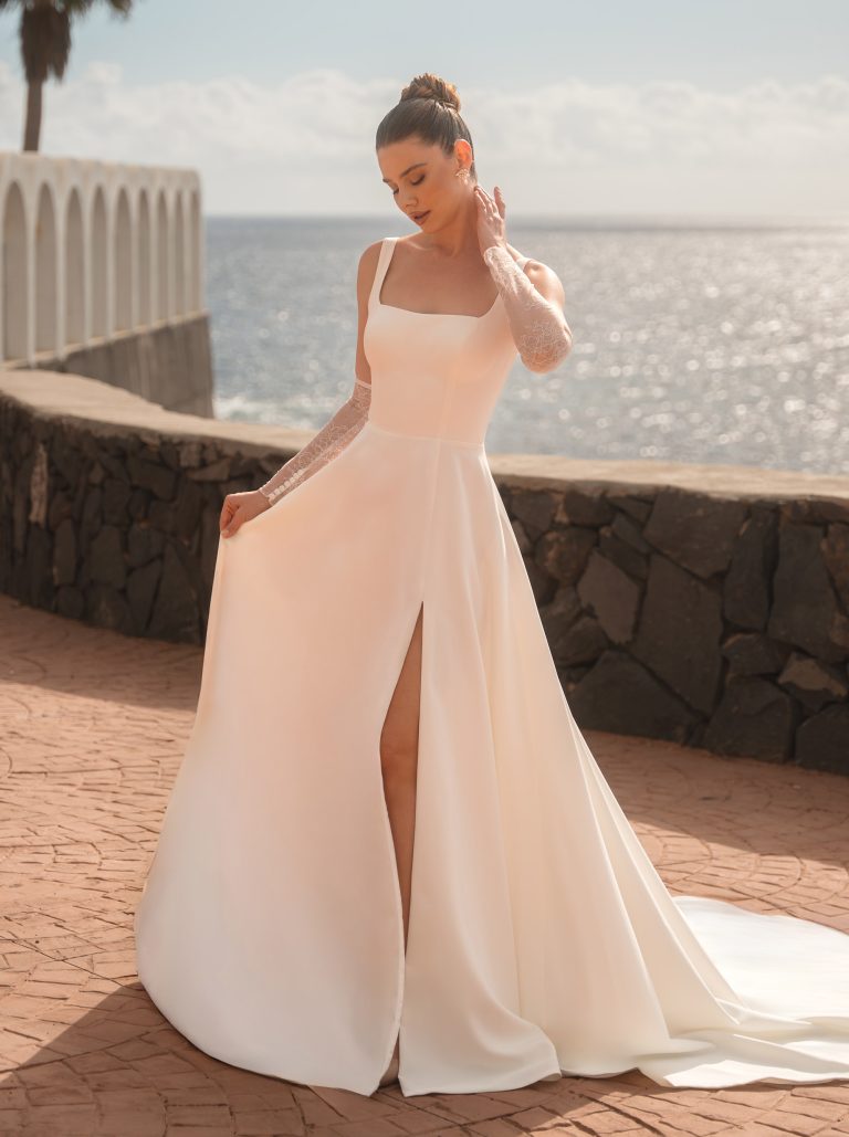 L’abito da sposa Gardenia Tropicale esalta il minimalismo con una linea pulita in mikado, scollo dritto con spalline ampie e un audace spacco. Le maniche in pizzo removibili aggiungono un tocco sofisticato e versatile.