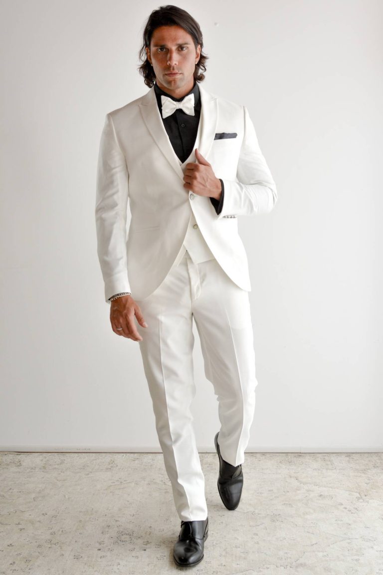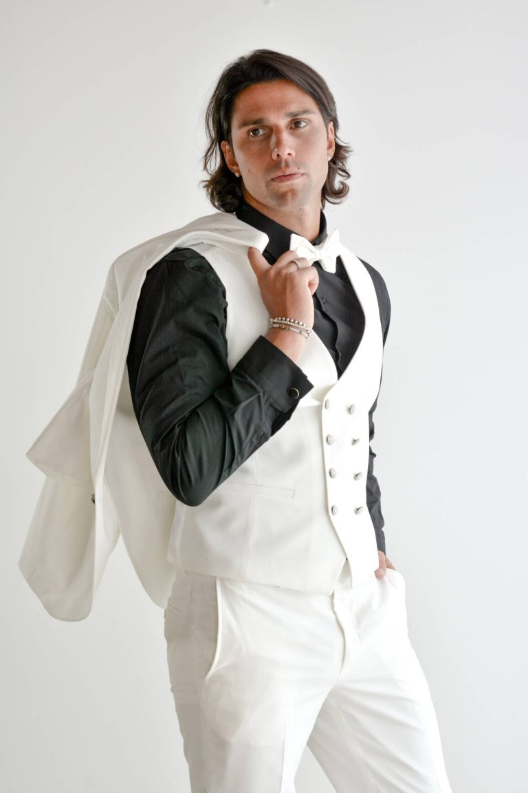 Abito da sposo realizzato in tessuto cotonato, composto da gilet doppiopetto e papillon in tinta. Perfetto per un Beach Wedding