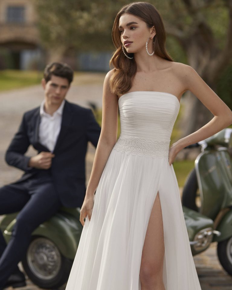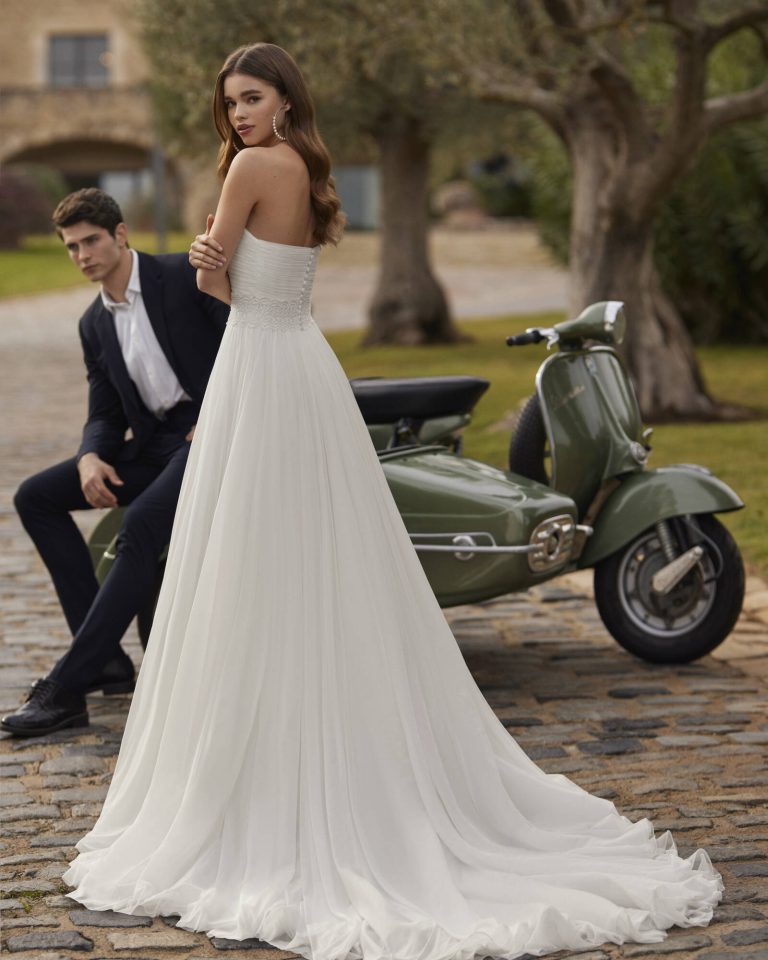 Abito da sposa lungo dal taglio dritto in stile boho confezionato in mussola con intarsi di pizzo e strass. Il corpetto senza spalline presenta un’abbottonatura sulla schiena ed è abbinato ad una gonna con spacco frontale e ad una mantella.