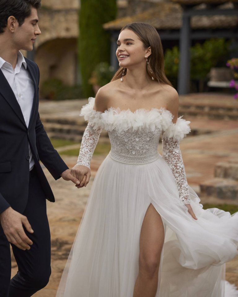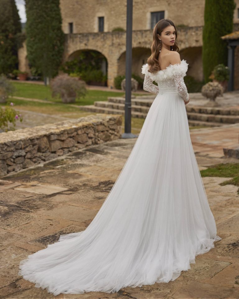 Abito da sposa lungo dal taglio dritto in stile boho confezionato in pizzo e strass con gonna in tulle. Corpetto con scollo senza spalline, schiena chiusa da un’abbottonatura e maniche rimovibili. Completano l’abito il dettaglio cut-out laterale e il fiore decorativo.