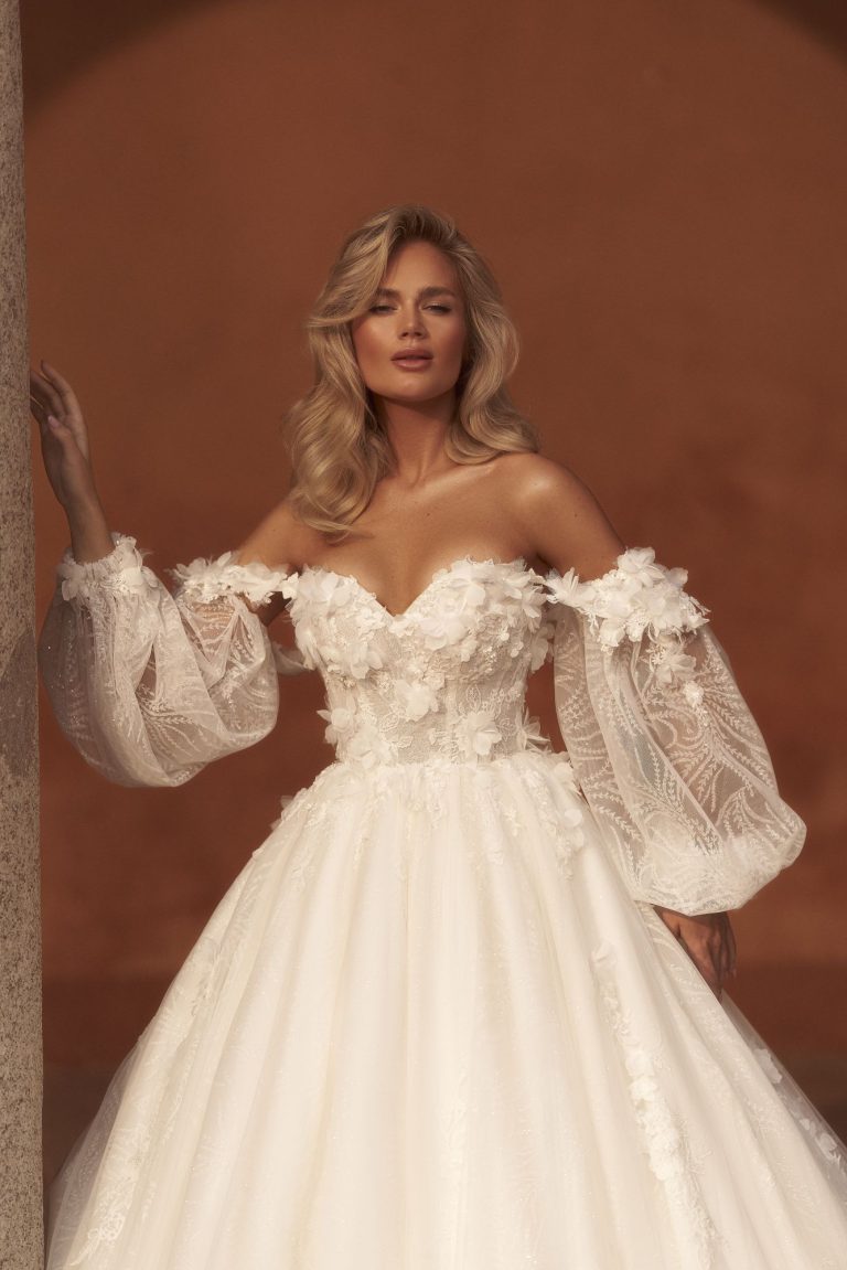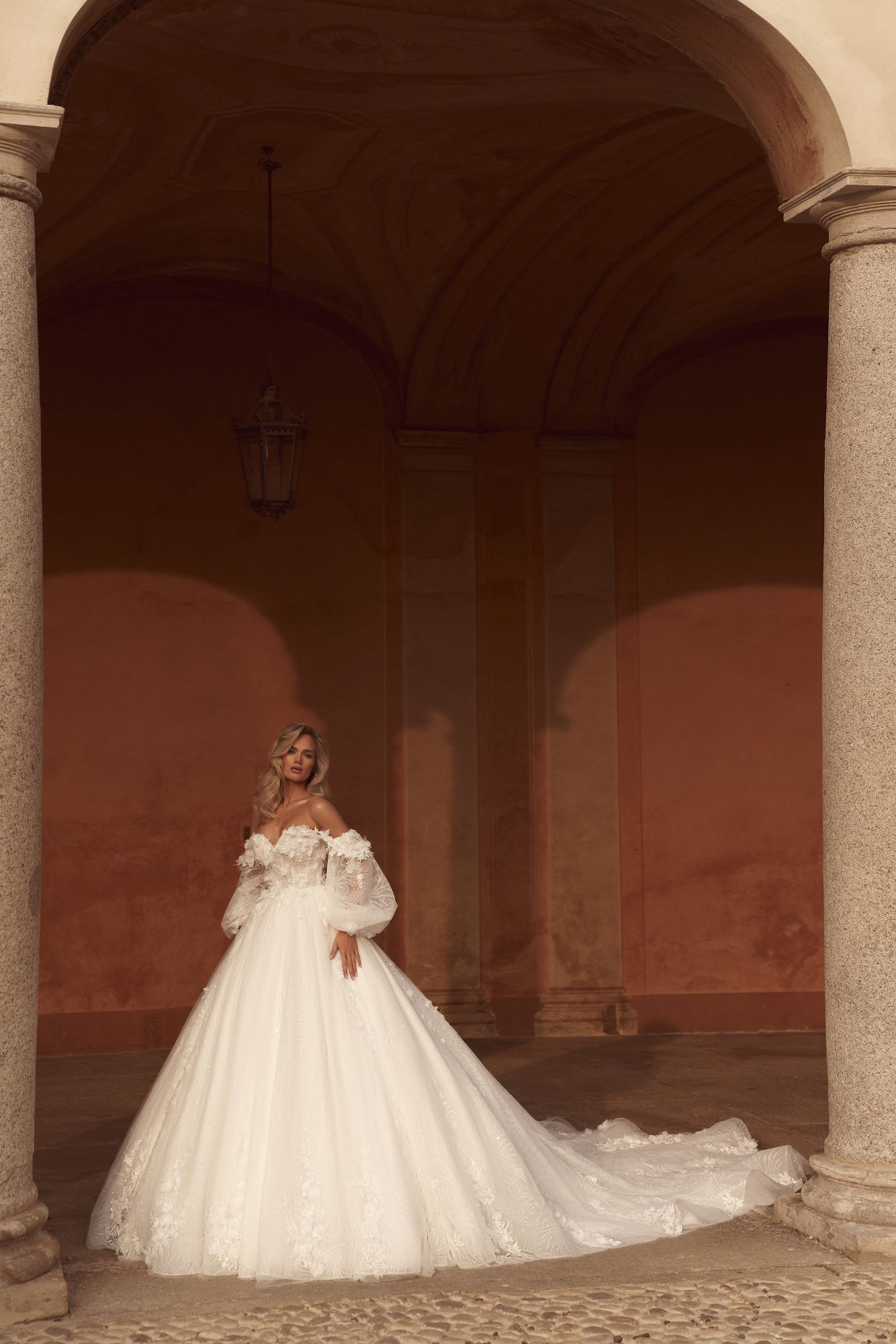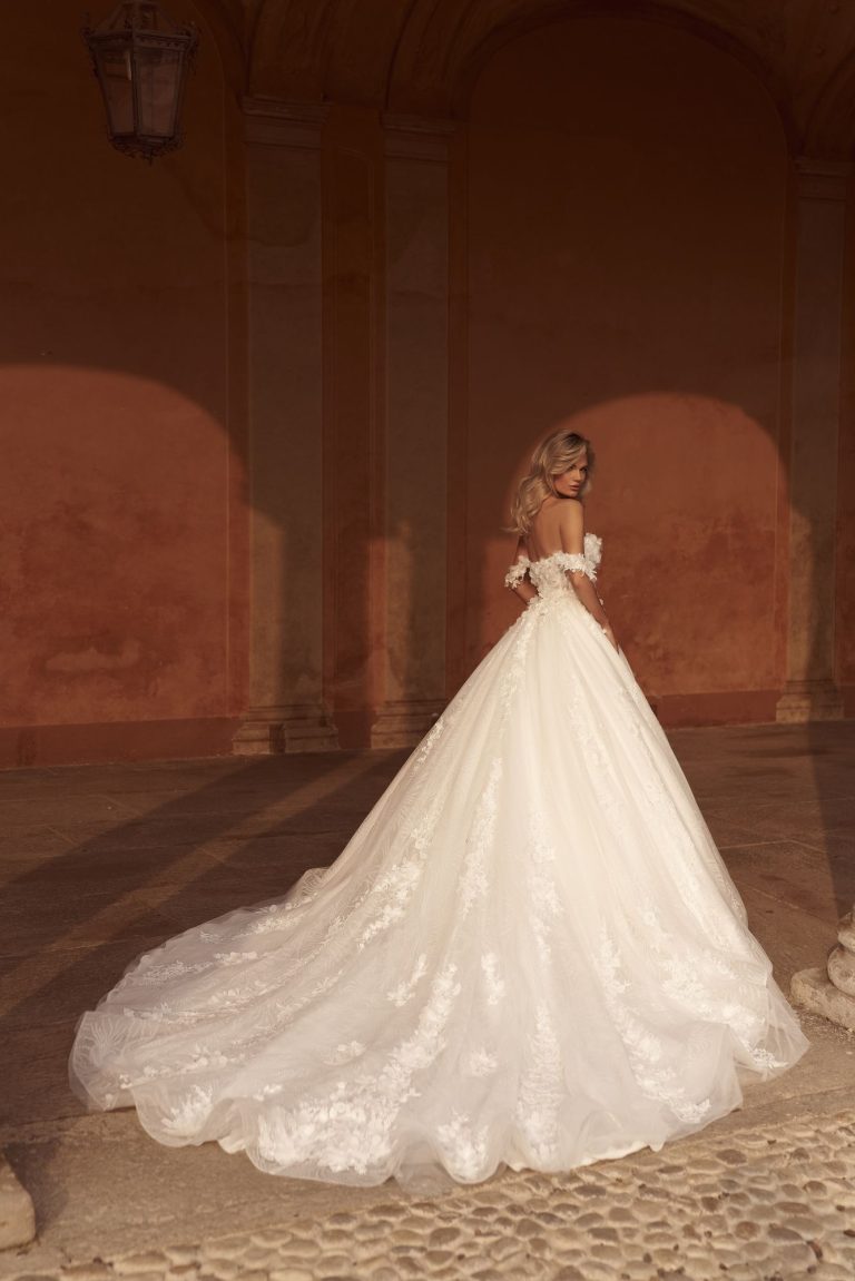 Abito da sposa principesco, pensato per una ragazza dall’animo romantico che desidera un matrimonio fiabesco.
