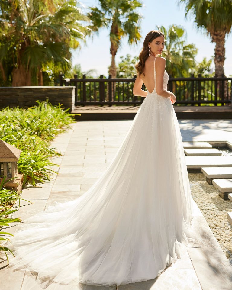 Abito da sposa a trapezio con gonna a ruota in tulle abbinata a pizzo ricamato; scollo profondo e schiena aperta con spalline sottili. Look unico di Adriana Alier.