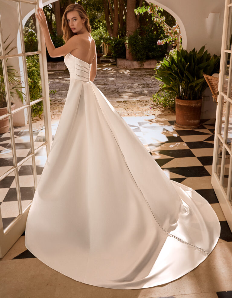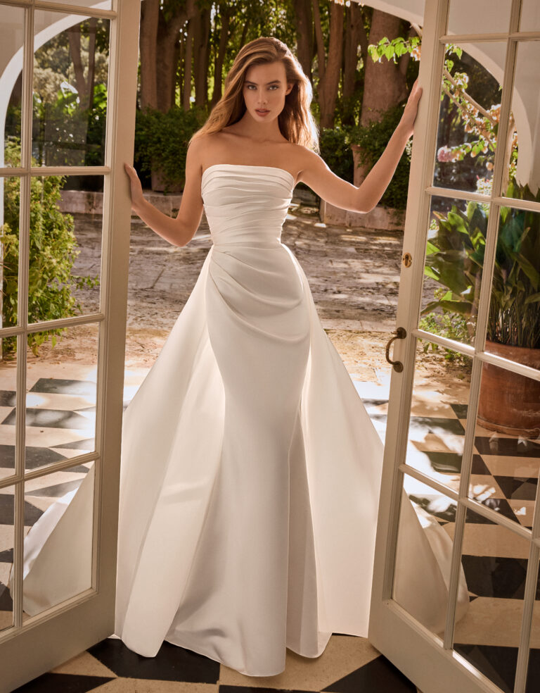 Abito da sposa a sirena dallo stile semplice realizzato interamente in raso che abbina un corpetto drappeggiato e uno strascico rimovibile.