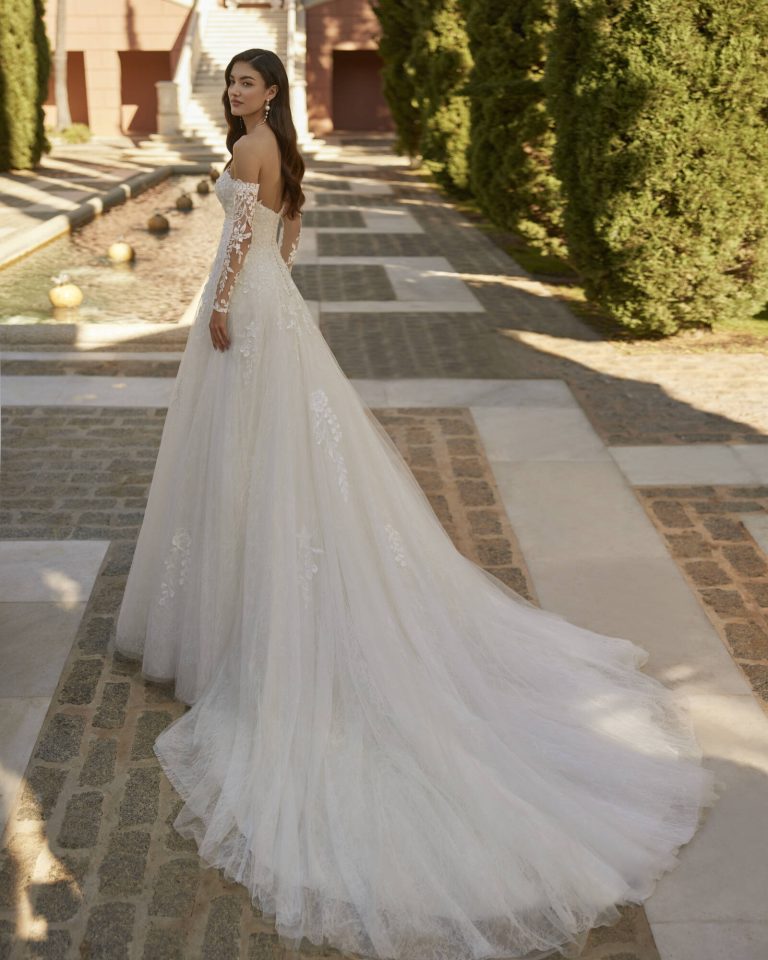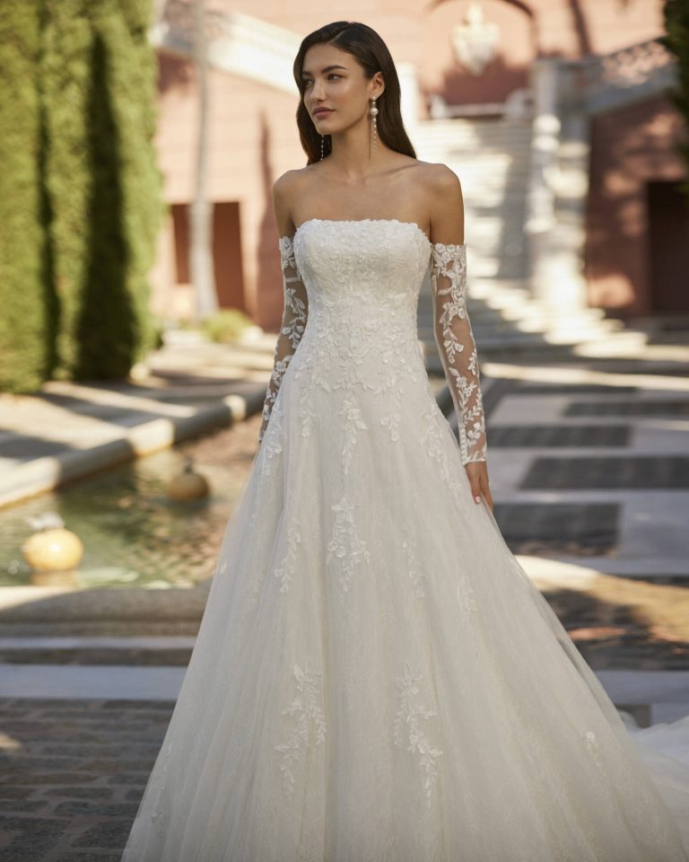 Romantico abito da sposa redingote confezionato in pizzo e tulle. Il corpetto del modello Indira mostra uno scollo dritto senza spalline mentre la schiena è chiusa da un’abbottonatura elegante. Manicotti realizzati in pizzo pregiato.
