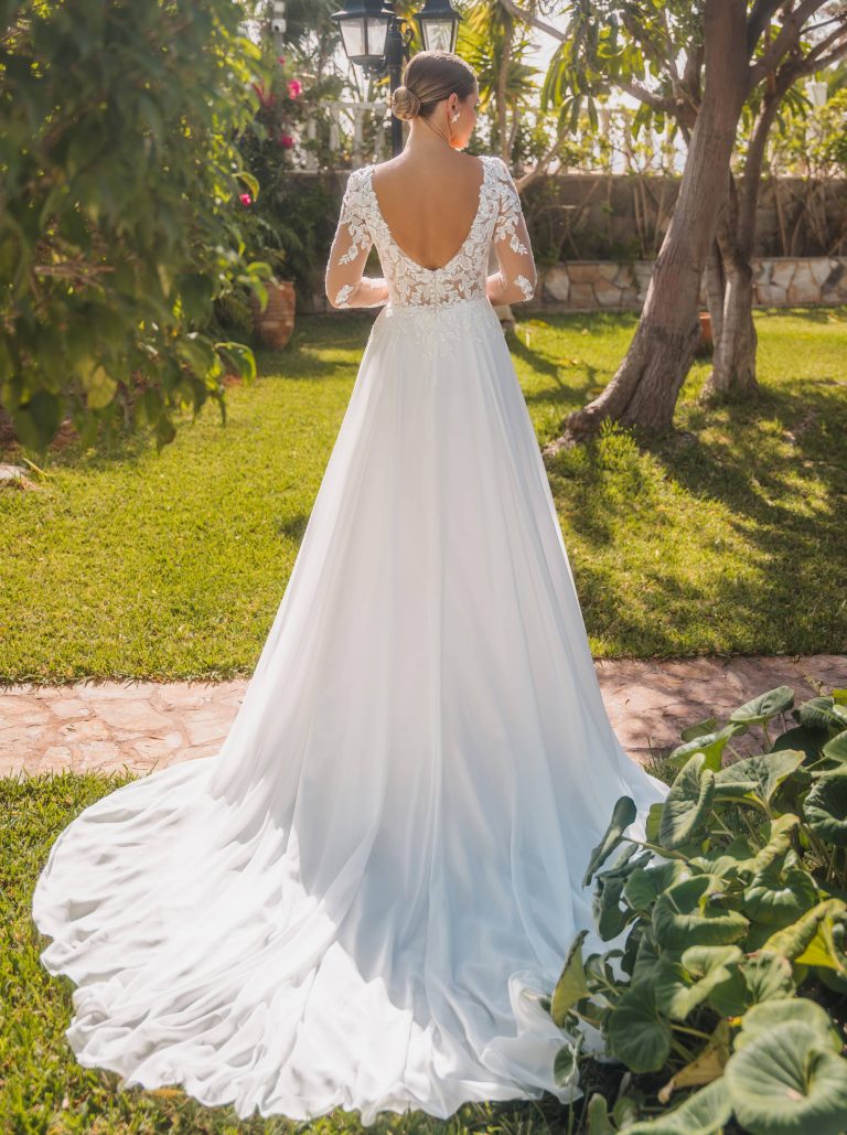 Iris Blue è un abito da sposa sofisticato e seducente, con corpetto in tulle effetto tattoo interamente ricamato e maniche lunghe in pizzo floreale. La gonna in chiffon fluido con spacco laterale dona leggerezza e carattere a ogni passo.