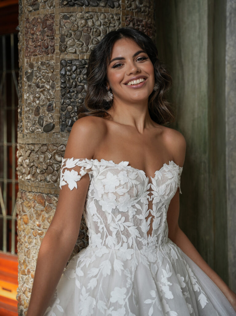 Il modello Istriana da vita ad un abito da sposa incantevole in tulle glitter, con ricami floreali ramage e maniche off-shoulder. Romantico, luminoso e d’effetto.