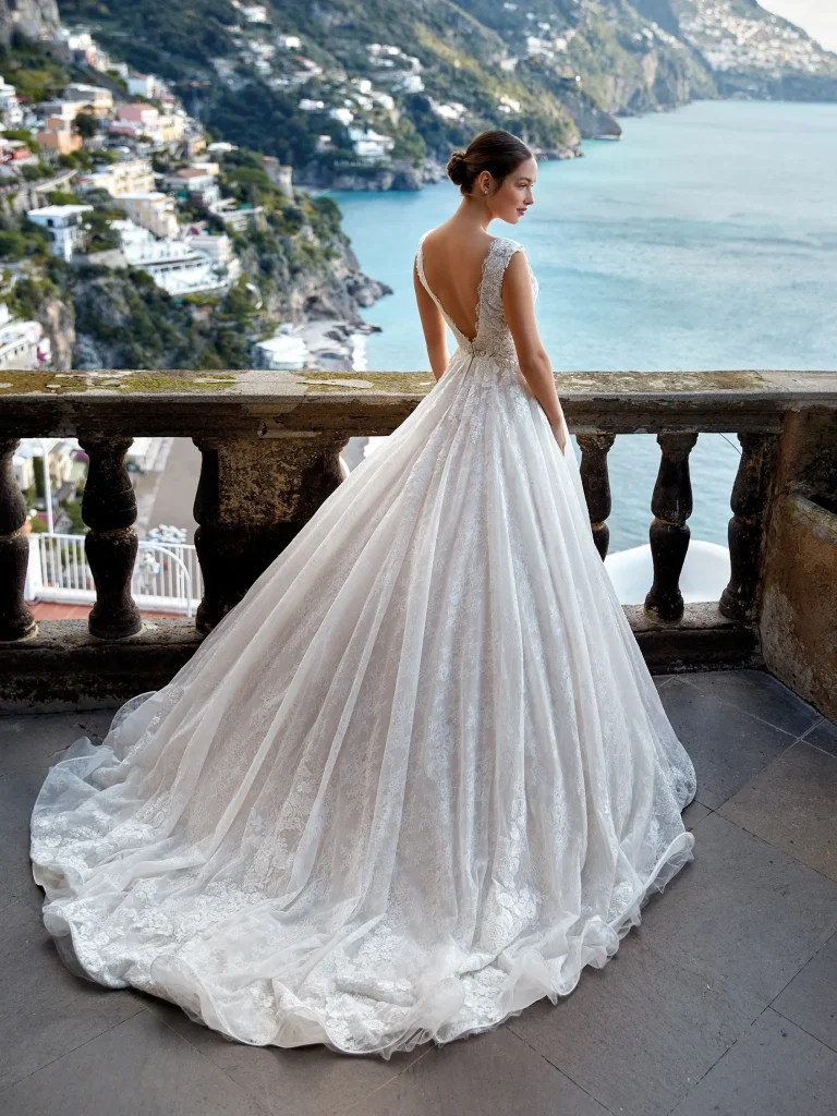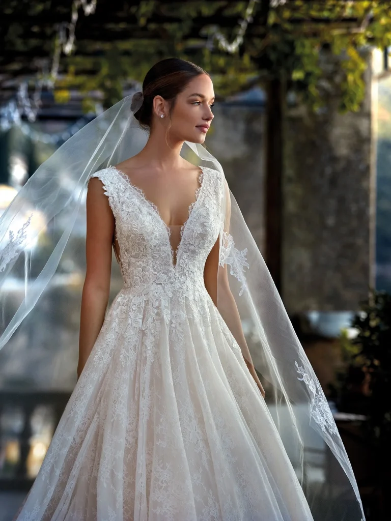Romantico abito da sposa con voluminosa gonna linea ad A in tulle e multistrati di pizzo. La scollatura profonda a V e il pizzo chantilly di questo abito ti faranno innamorare!