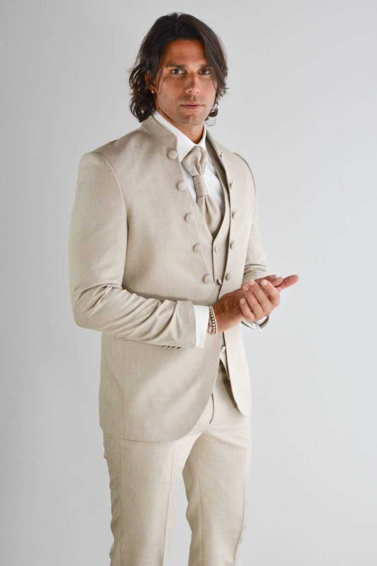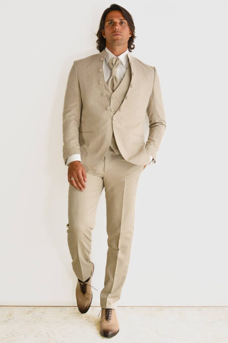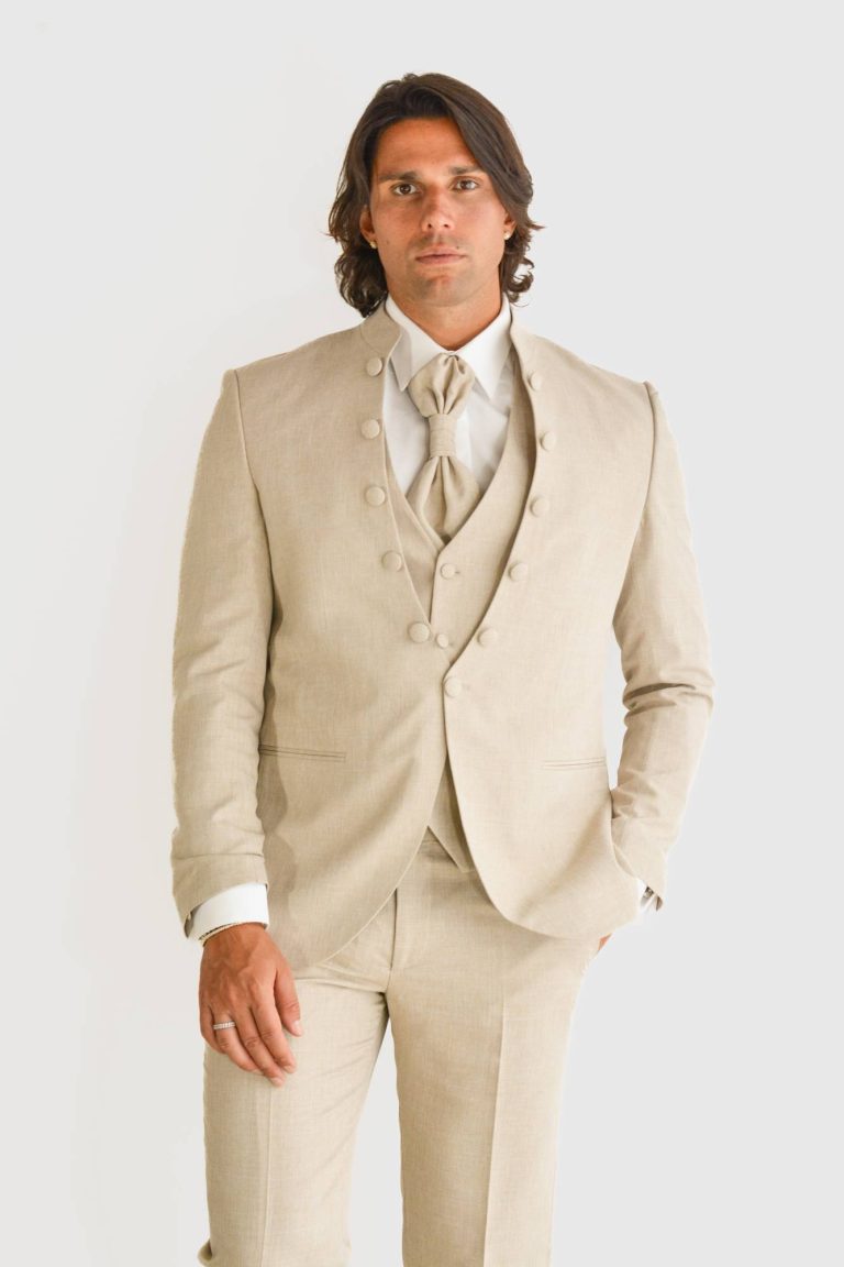 Coreana slim fit con cravattone e gilet in tinta, il modello James Dean è disponibile sia in verde brillante che in color sabbia.