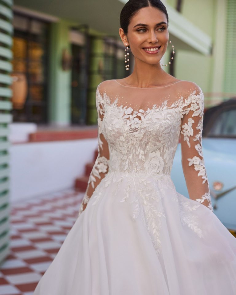 Abito da sposa principesco a maniche lunghe, scollo illusion e schiena trasparente.