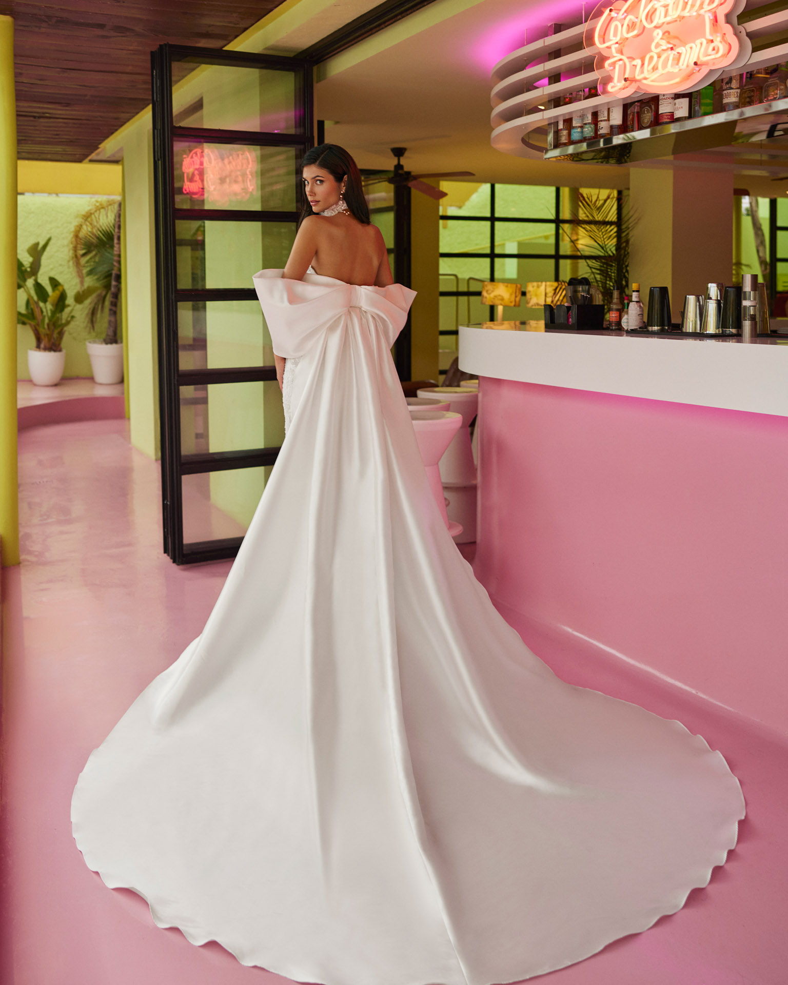 Abito da sposa a sirena, realizzato in pregiato pizzo e ricamato con perline, caratterizzato da scollo a cuore, manicotti, collarino e mantello.