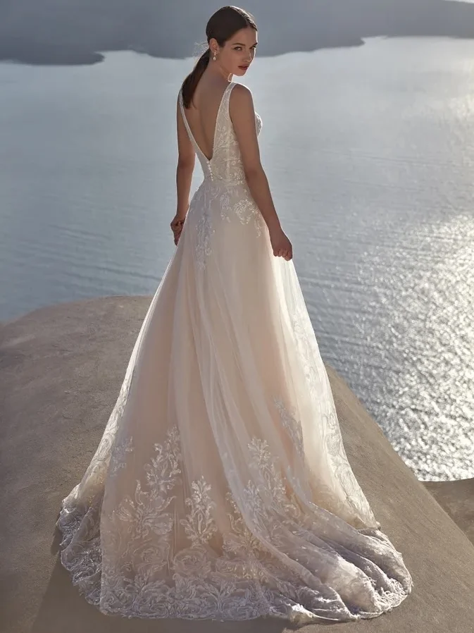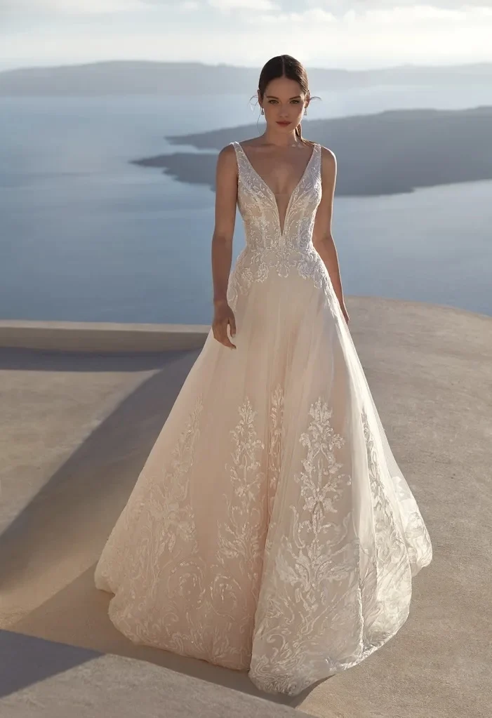 Abito da sposa in tulle ricamato con profondo scollo a V e gonna leggera dal fascino etereo. I ricami in pizzo floreale si fondono con la trasparenza per creare un look romantico e raffinato, perfetto per un matrimonio da sogno.