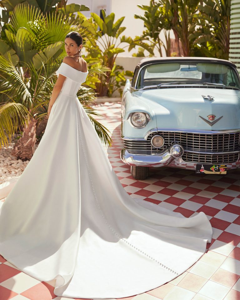 Abito da sposa elegante e raffinato, realizzato in mikado Verona con scollo a barca e schiena scoperta, degno di nota lo spacco laterale nella gonna.
