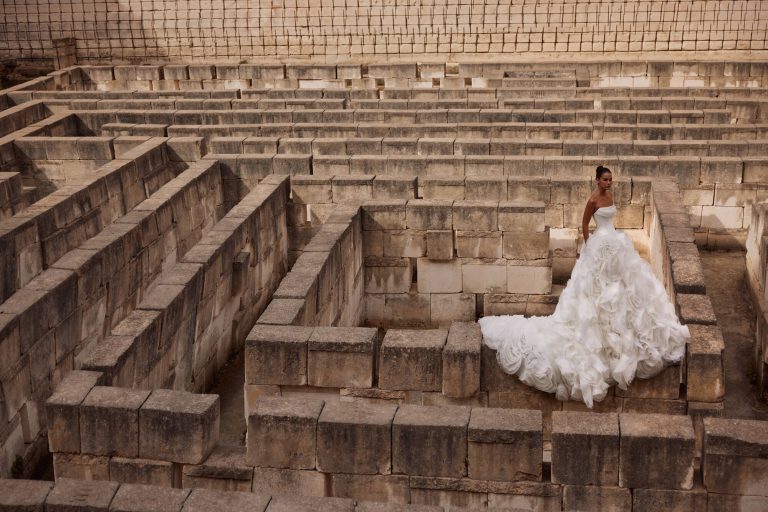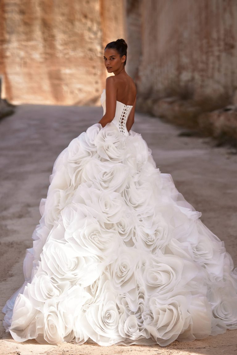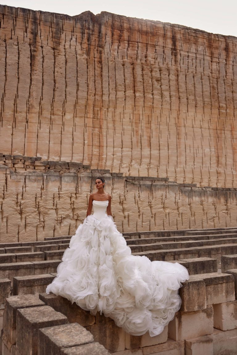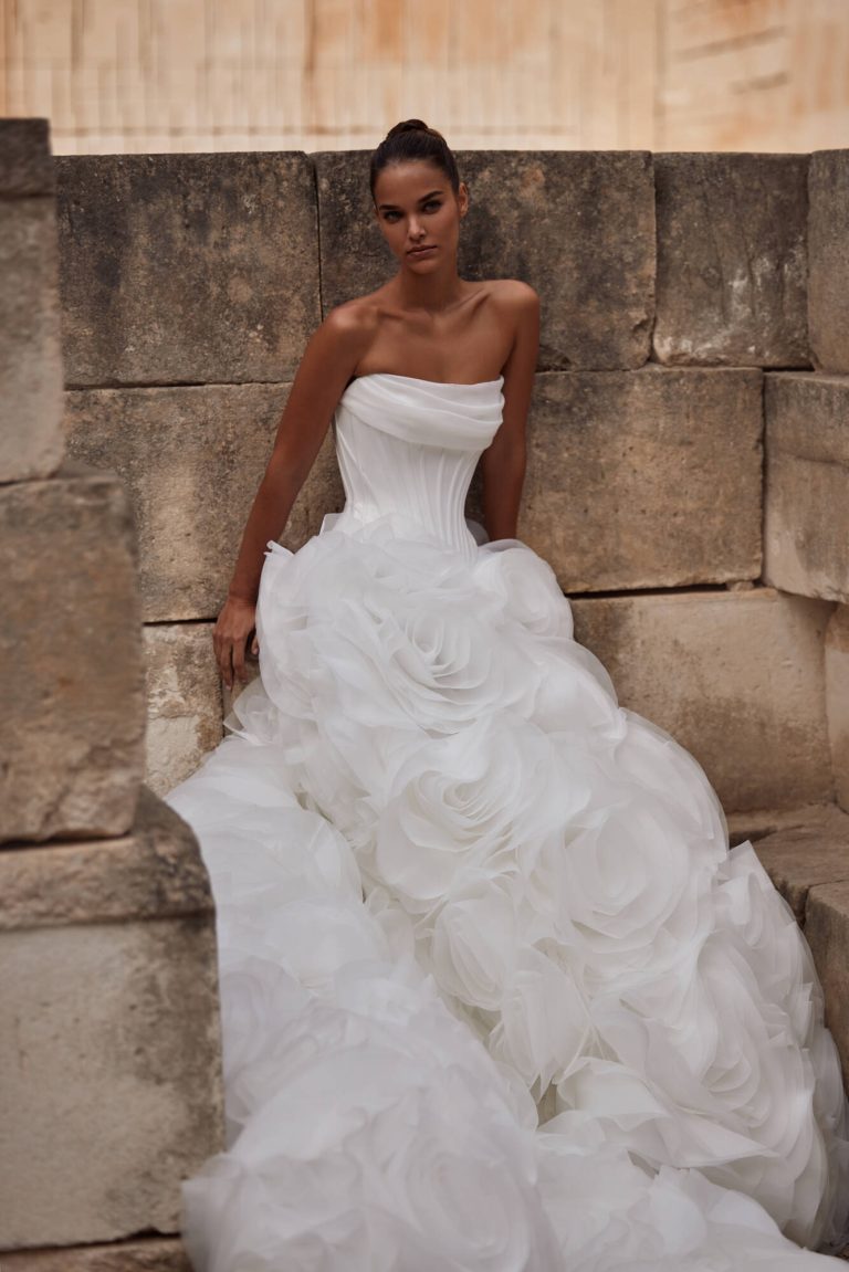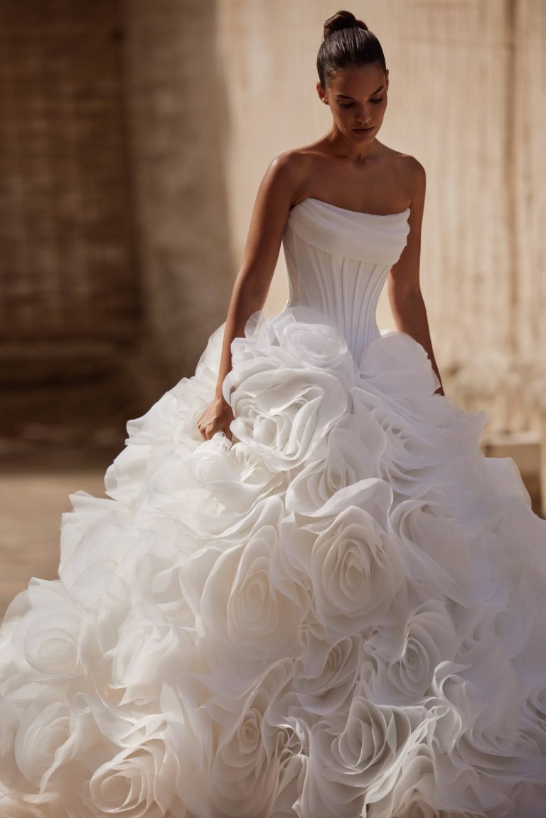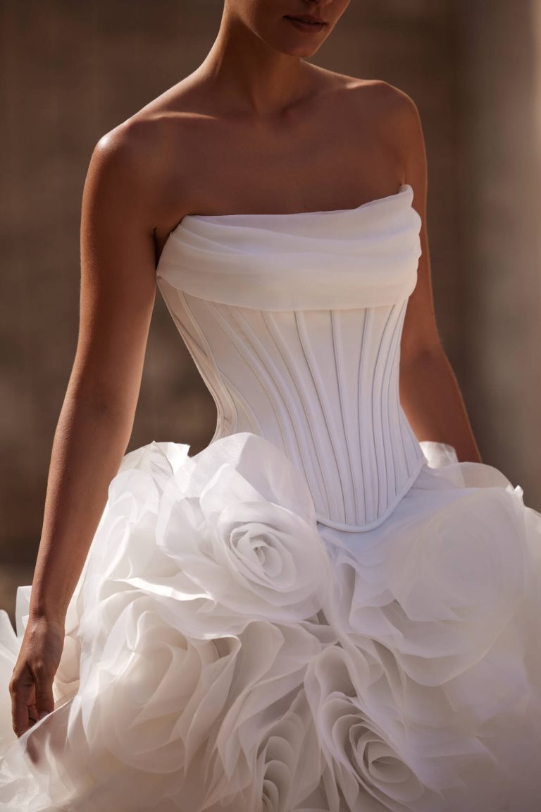 Karslen: Abito da sposa due pezzi che ruba l’attenzione con la sua gonna eccezionalmente volumetrica. E’ caratterizzato da un corsetto in mikado con stecche doppie, scollo drappeggiato e un corsetto modellante aggiuntivo cucito. Degna di nota la gonna rigogliosa e voluminosa meticolosamente realizzata a mano con dozzine di strati di organza modellati a fiori.