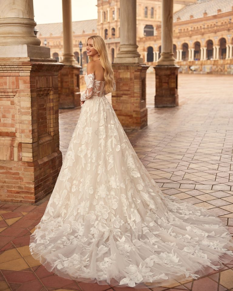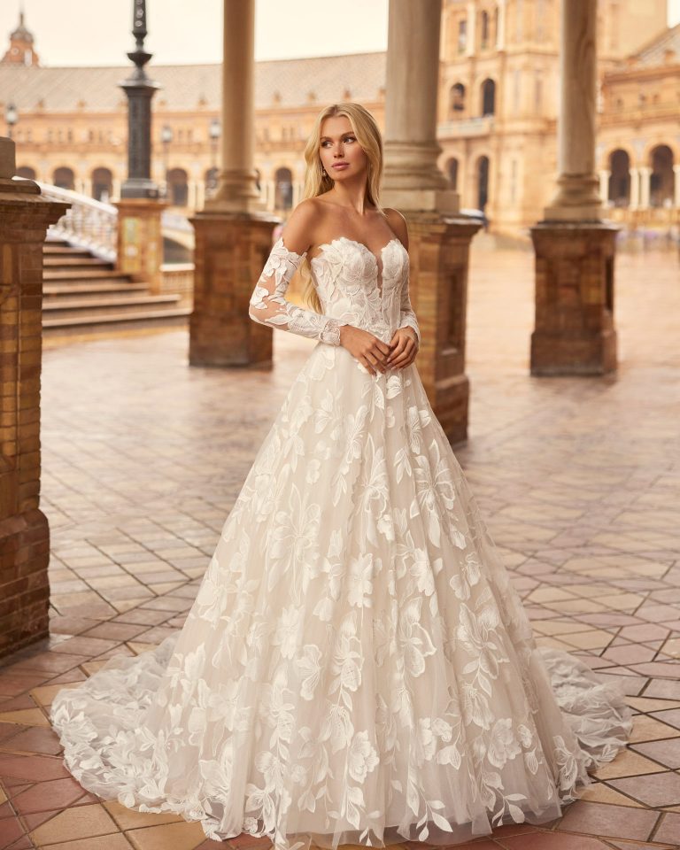 Abito da sposa a linea ad A in tulle e pizzo, con scollo a cuore, maniche lunghe e schiena con corsetto. Il delicato mix di tulle e pizzo conferisce un tocco romantico, mentre il corsetto sulla schiena assicura una vestibilità perfetta. Ideale per una sposa elegante e sofisticata, con un design dalla linea haute couture.
