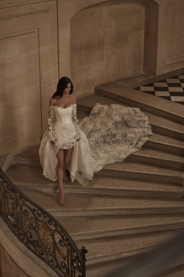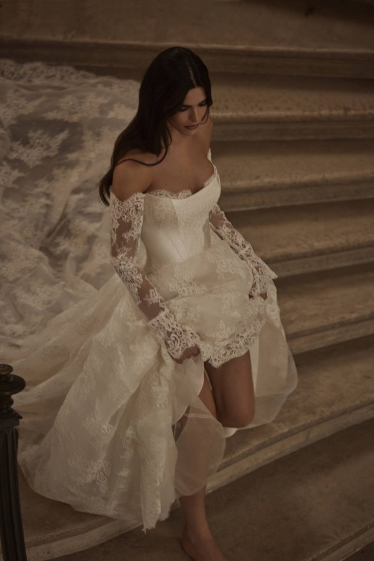 Grazioso abito da sposa con maniche lunghe e spalle scoperte, realizzato in pizzo chantilly. Caratterizzato da scollo a forma di cuore, corsetto trasparente con stecche con maniche lunghe che lasciano le spalle scoperte e maxi gonna da principessa con maxi strascico.