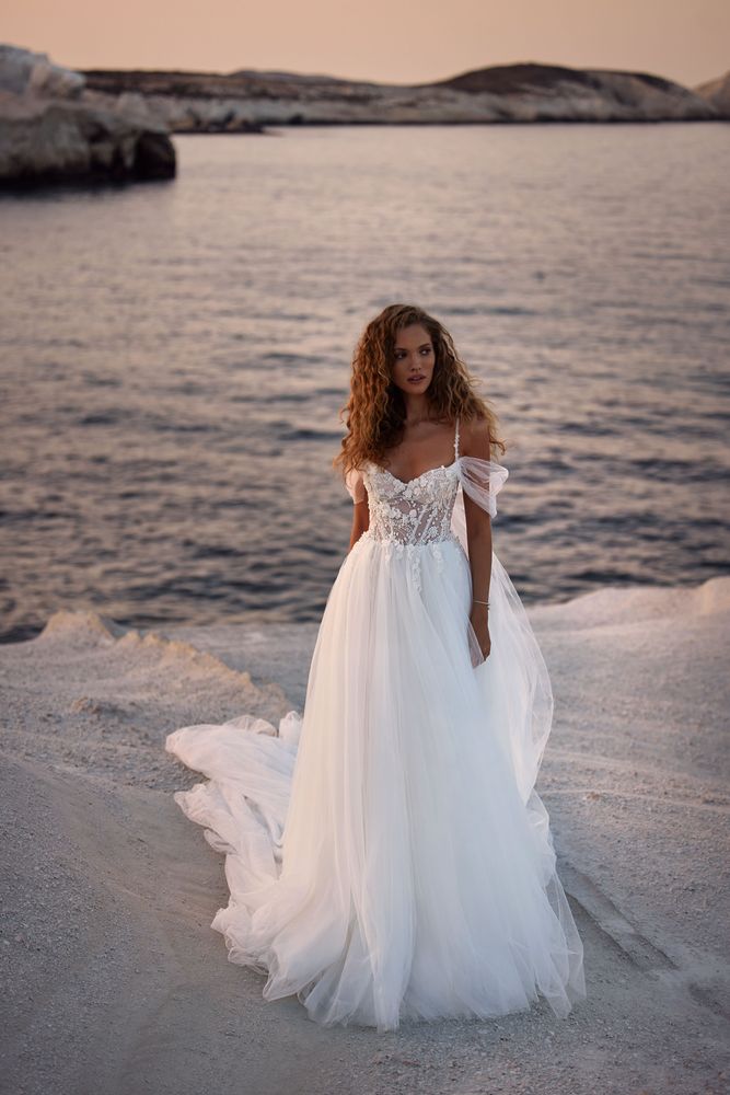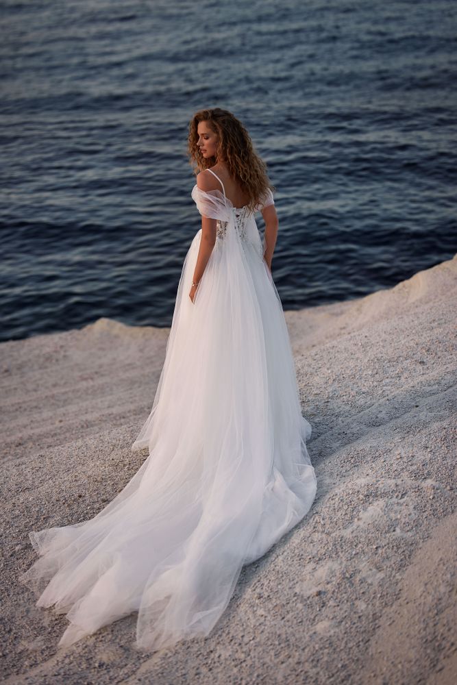 Adorabile abito da sposa in tulle ricoperto di glitter sulle spalline con maniche a sbuffo trasparenti e spalle scoperte, corsetto a forma di cuore, spacco sulla coscia e fiori 3D su tutto l’abito.