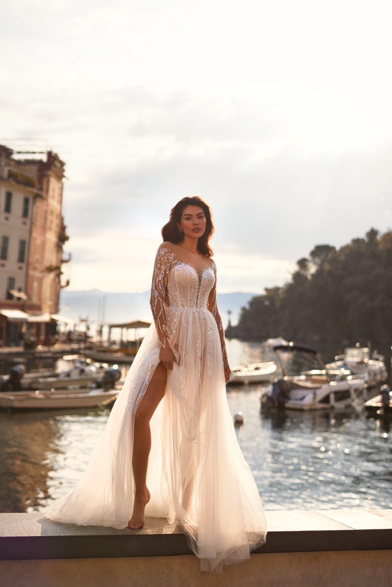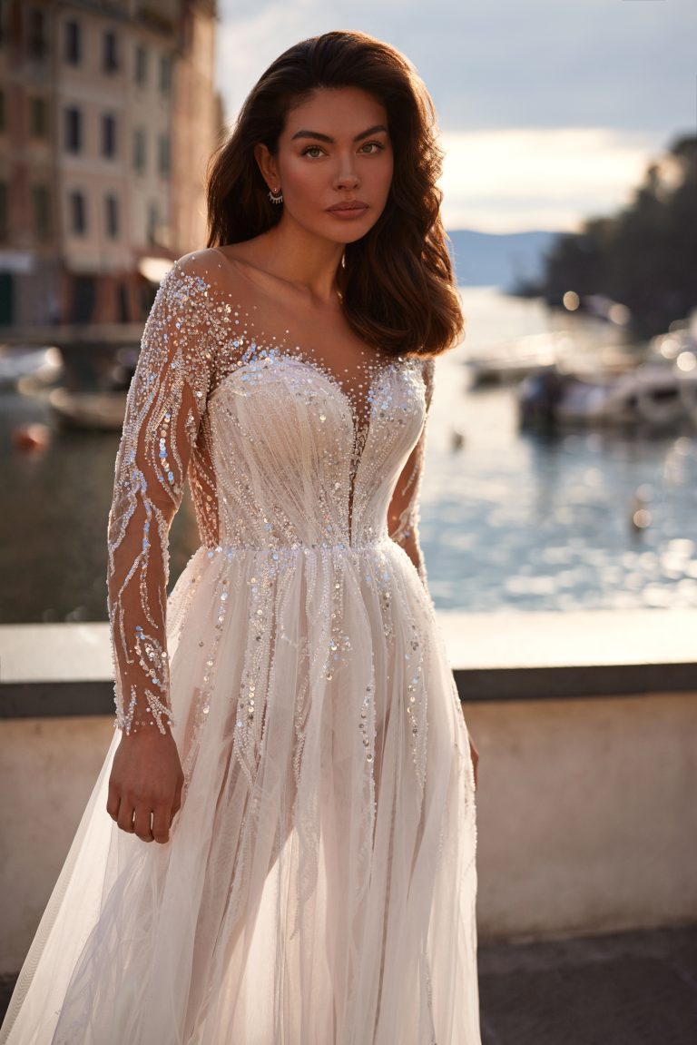 Vestito da sposa leggero e traslucido dalla classica linea ad A con maniche lunghe. L’abito è ricamato con perline, paillettes e cristalli. La schiena scoperta e la gonna leggera creano un look di grande effetto.