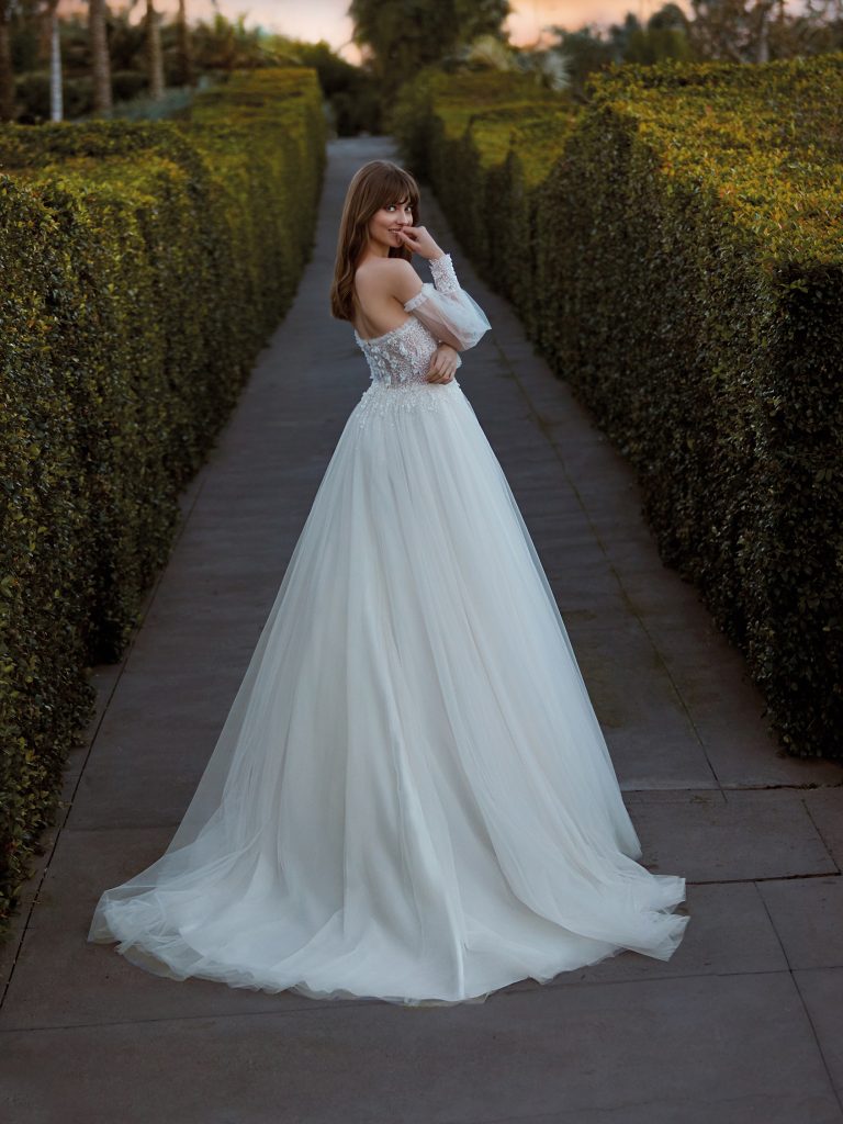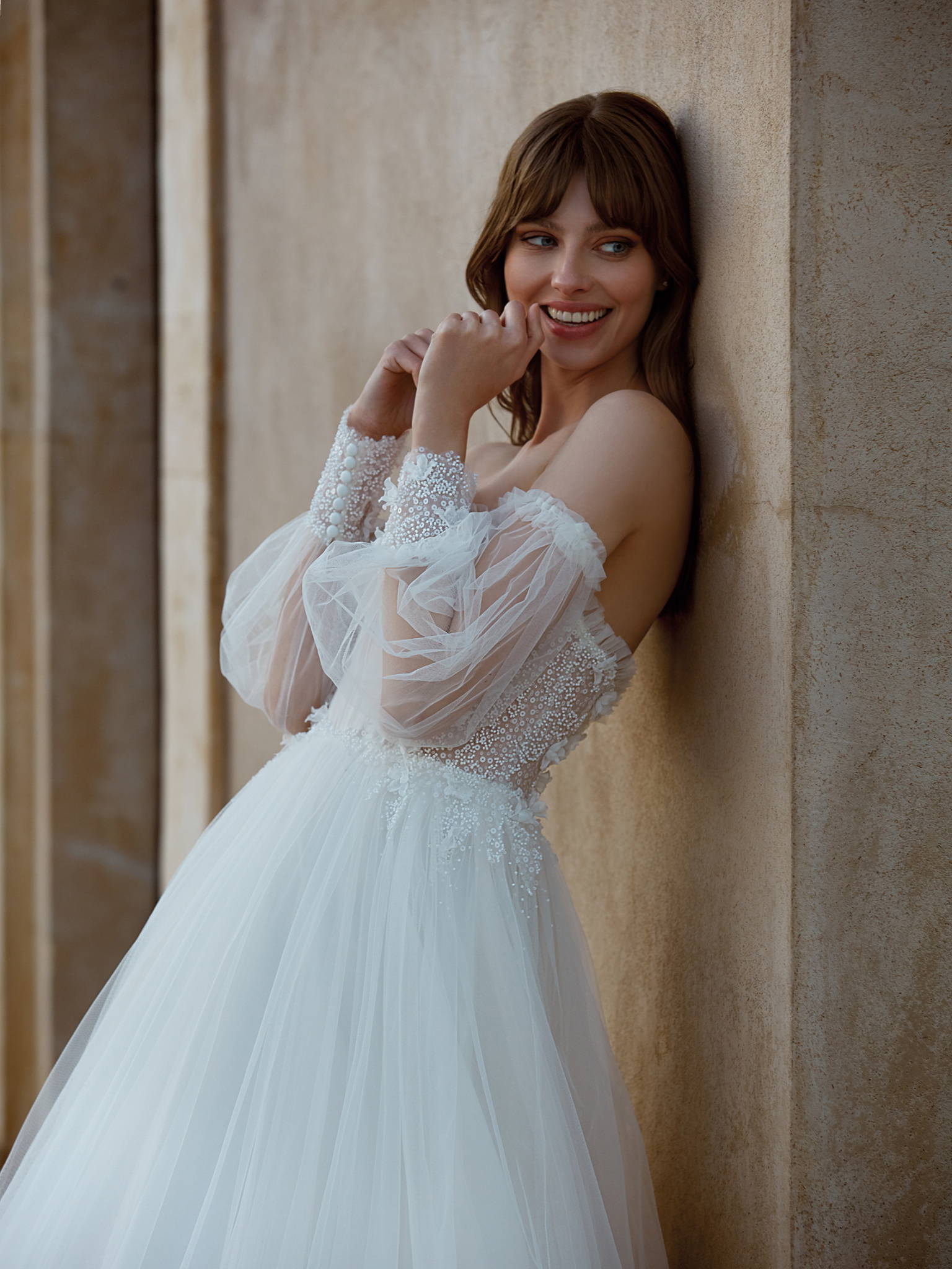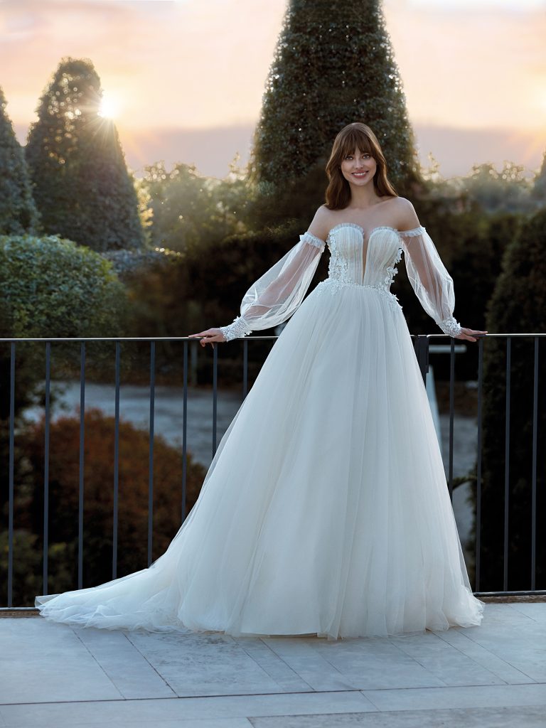 Abito da sposa principesco con corpetto bustier, maniche lunghe in tulle e gonna ampia. Un sogno romantico e moderno per spose che amano la magia senza tempo.