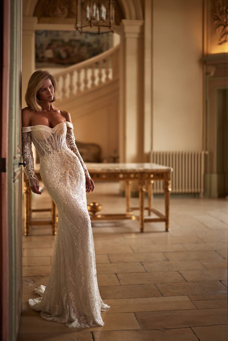 Splendido abito da sposa a sirena con maniche lunghe e spalle scoperte, realizzato in pizzo semitrasparente impreziosito a mano con paillettes, perle e applicazioni floreali 3D. Leroy è caratterizzato da dettagliato scollo a forma di cuore, corpetto decorato semitrasparente e maxi gonna aderente con strascico corto.