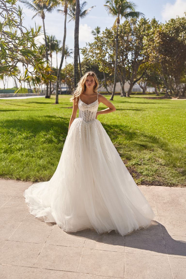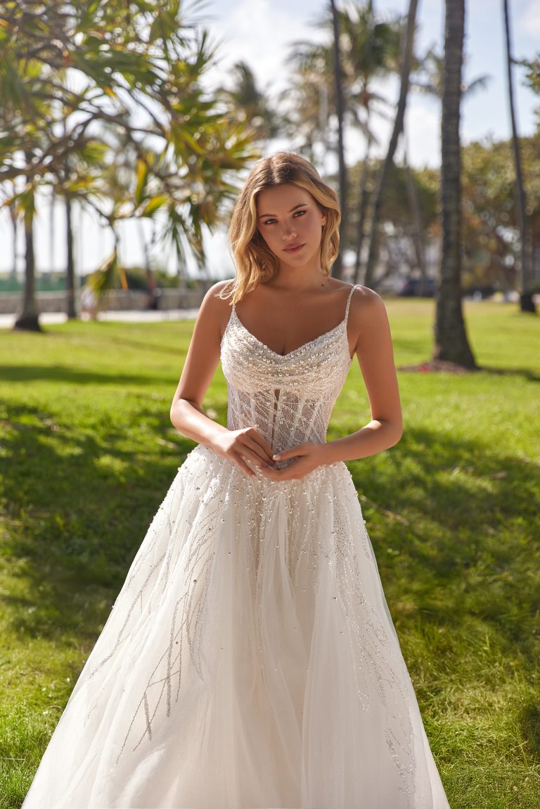 Lisandra è l’essenza di luce, dolcezza e lusso discreto. Abito da sposa dalla linea A scivolata si muove con leggerezza, mentre il corpetto in pizzo esalta lo scollo con grazia. Oltre mille perle cucite a mano brillano come rugiada, e delicati ricami floreali sbocciano sul tessuto, trasformando ogni passo in poesia. Un sogno di morbidezza e romanticismo, pronto per il tuo “sì”.