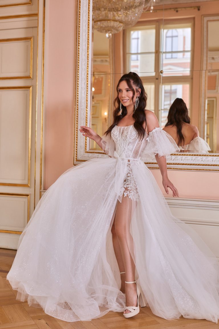 Stai cercando un abito da sposa eclettico per il tuo matrimonio? Un abito corto è la scelta perfetta, se desideri sfoggiare uno stile unico e vivace nel giorno delle sue nozze il modello Liz ti permetterà di avere tutto questo senza rinunciare al fascino di una romantica gonna lunga svolazzante.