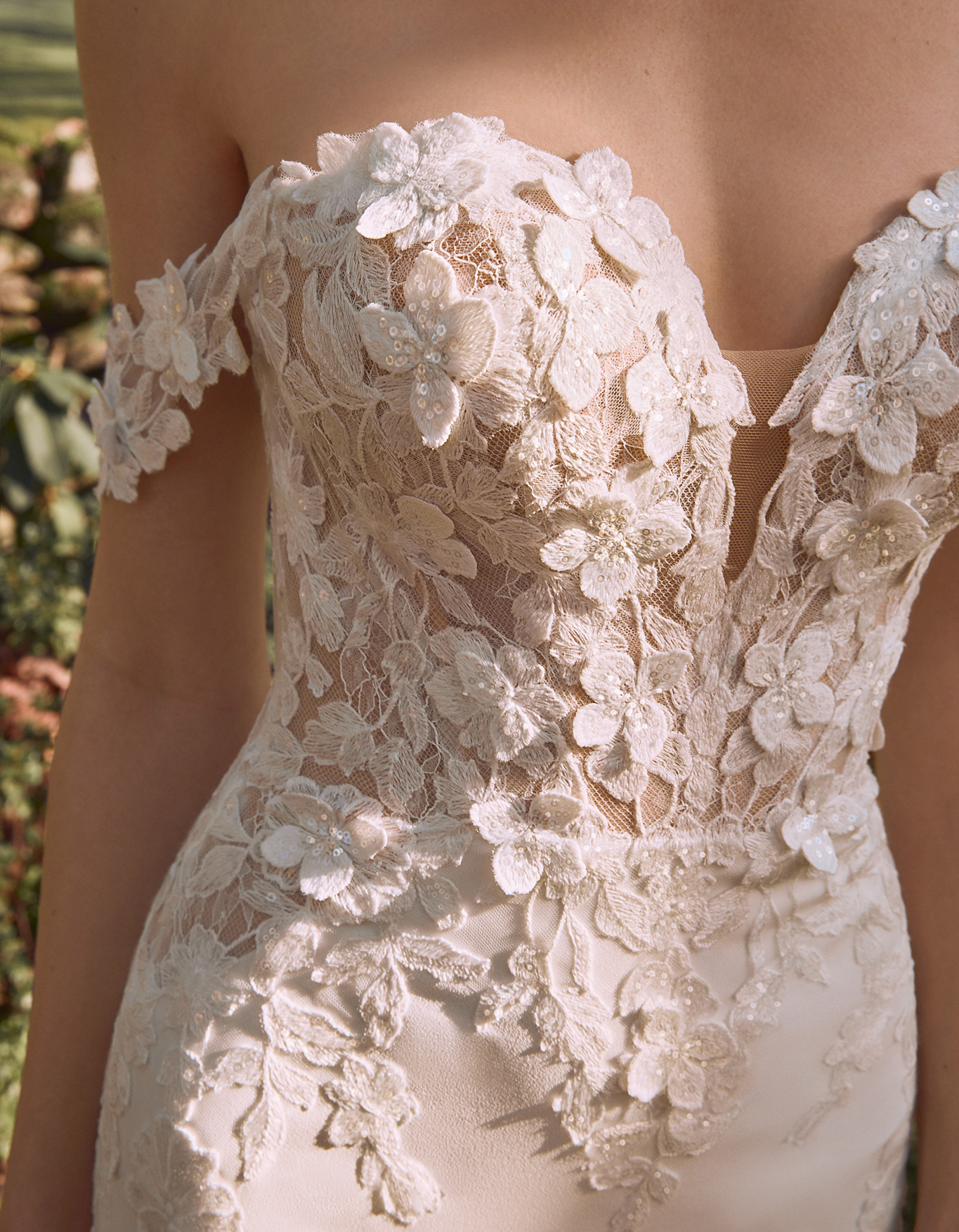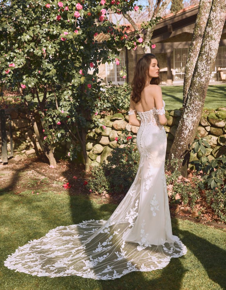 Abito da sposa a sirena dallo stile classico realizzato con applicazioni ricamate e motivi floreali che si estendono lungo il corpo creando un effetto sfumato con trasparenze.