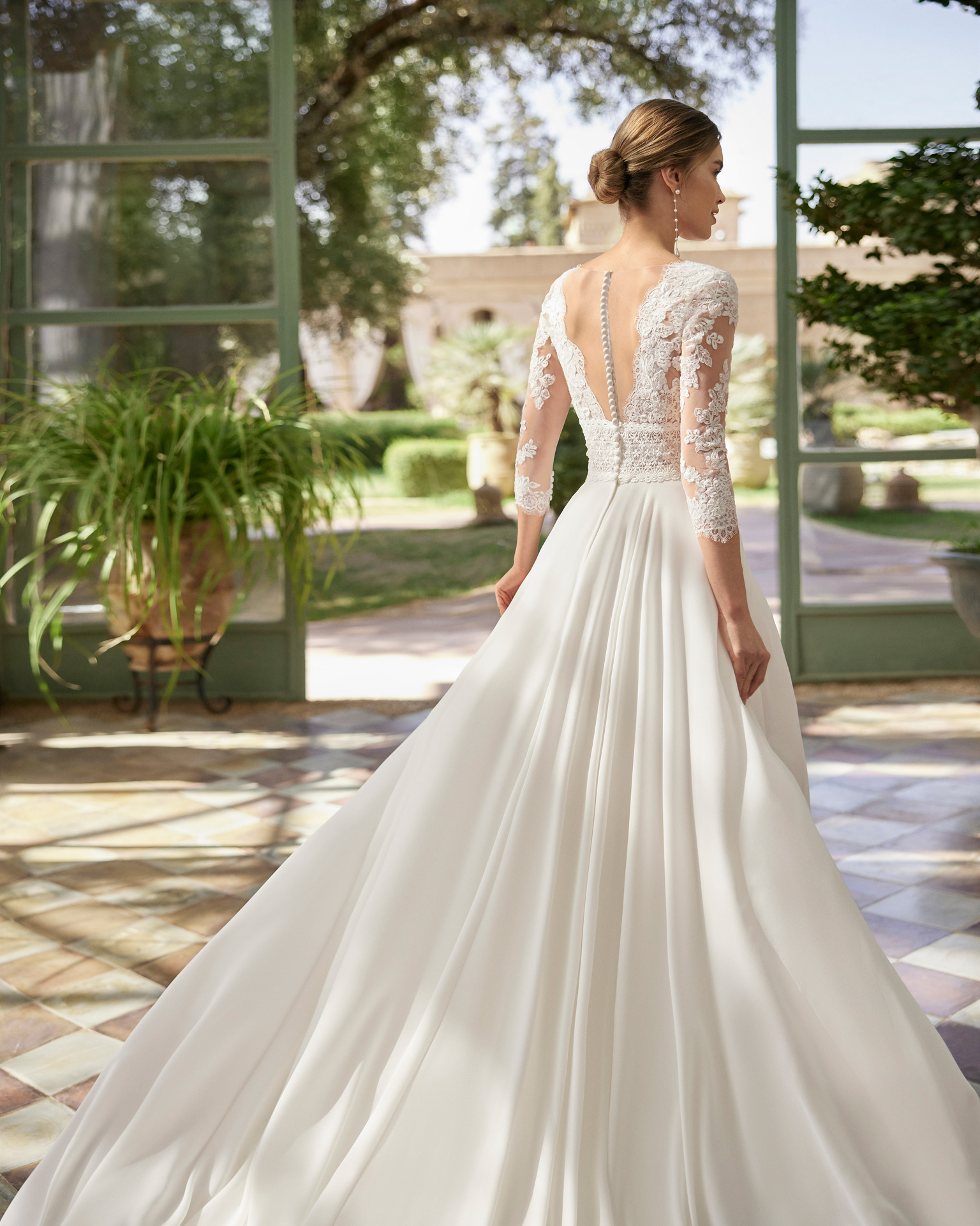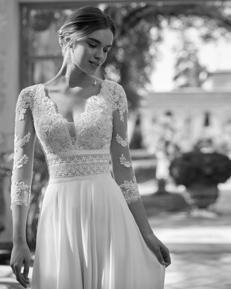 Romantico abito da sposa realizzato in pizzo e crêpe. Con scollo a V, schiena chiusa con bottoni e maniche francesi, questo è un look Alma Novia è un vero sogno.
