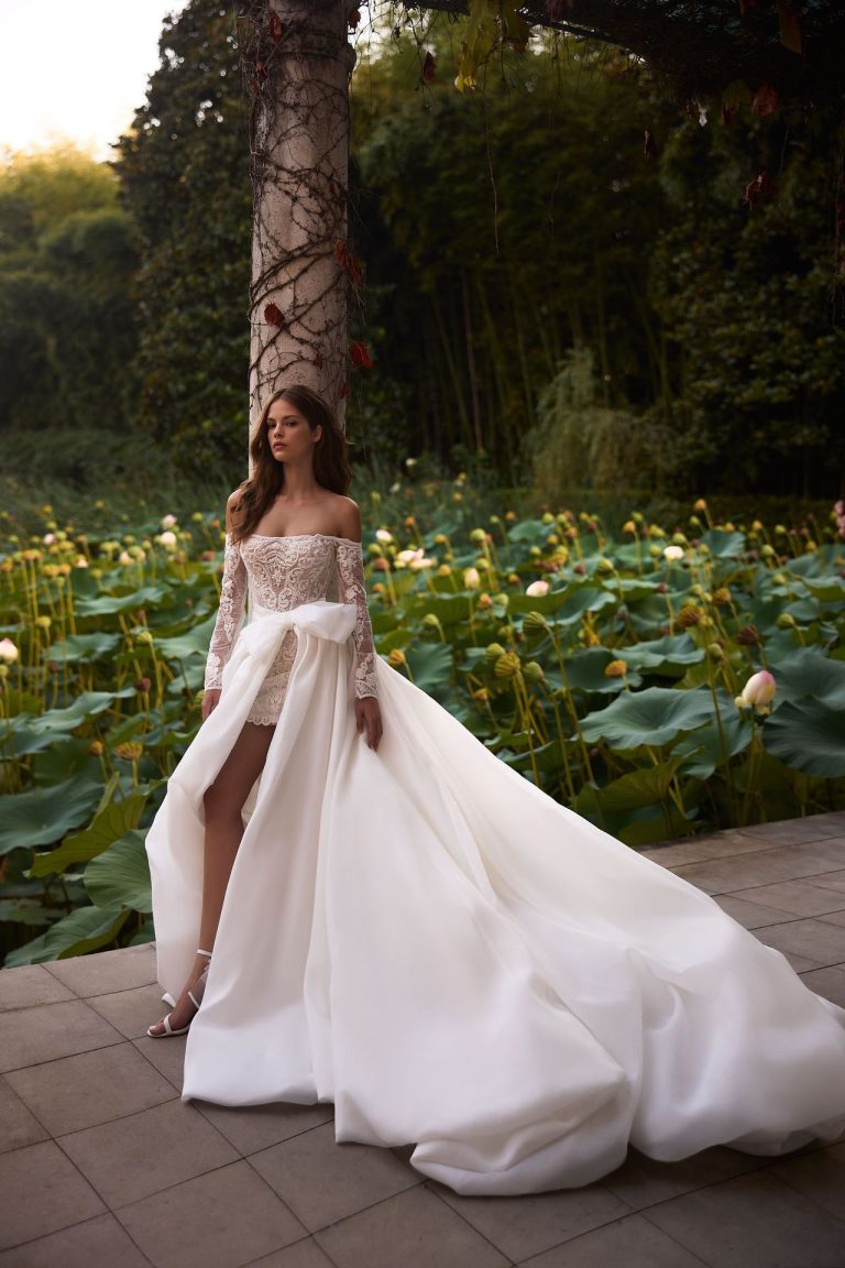 Splendido miniabito a maniche lunghe in pizzo chantilly e decorato con ricchi ornamenti in pizzo. Presenta maniche in pizzo con spalle scoperte, corpetto semitrasparente decorato con delicati motivi in pizzo, chiusura con zip e minigonna aderente con fodera avorio. Il look da sposa può essere impreziosito da una gonna Rhona.