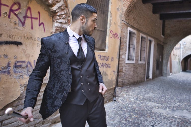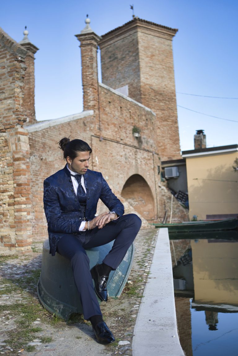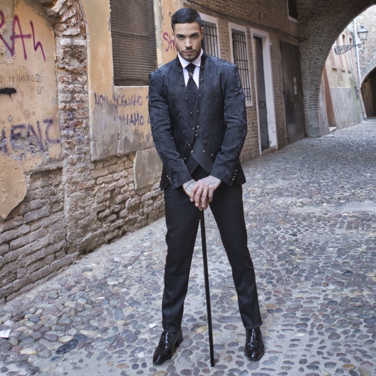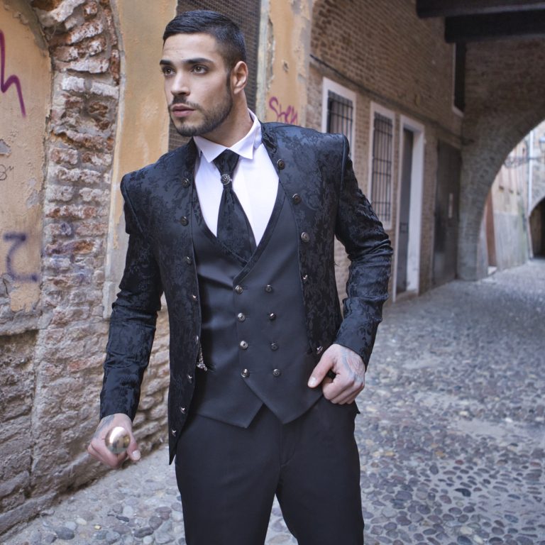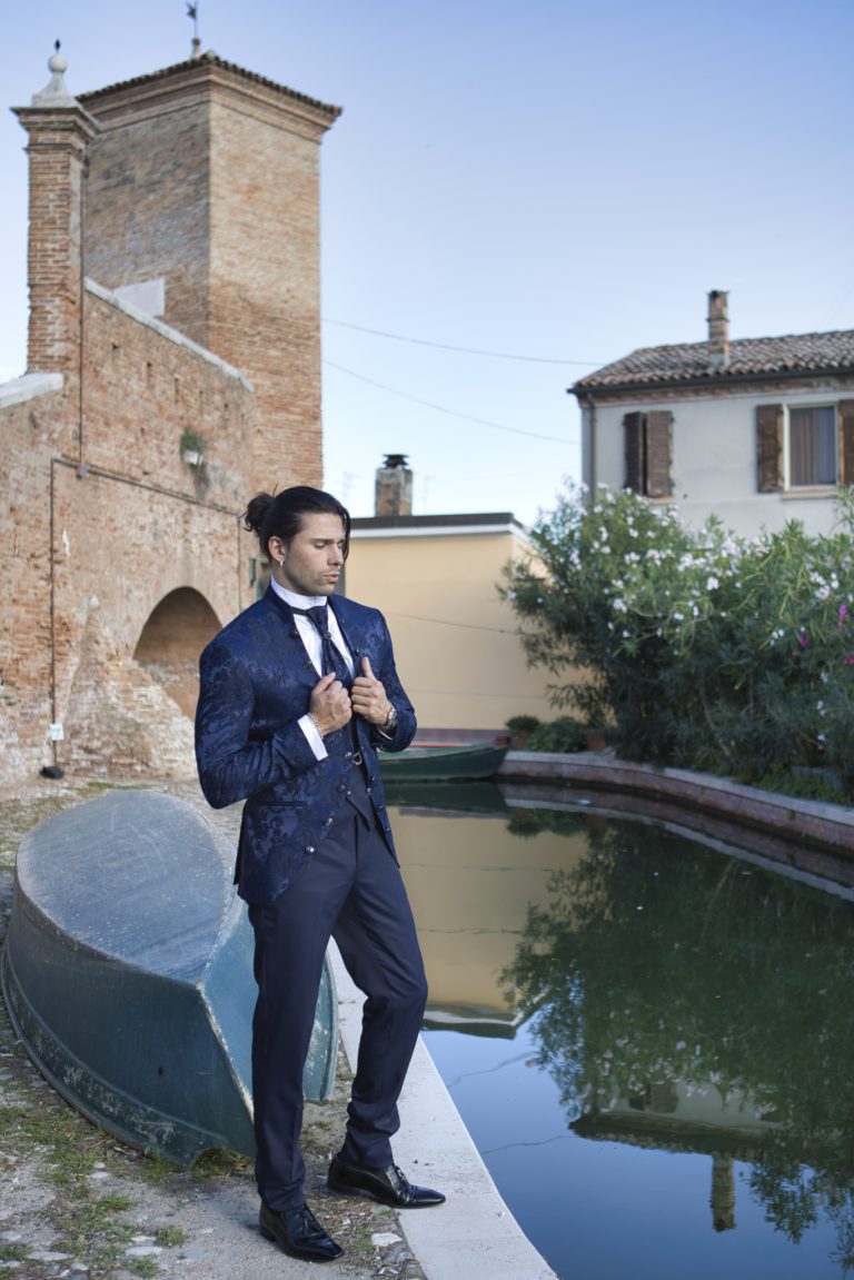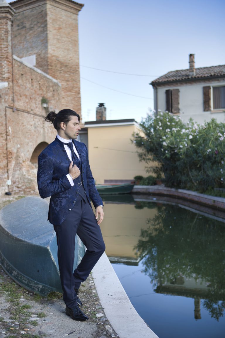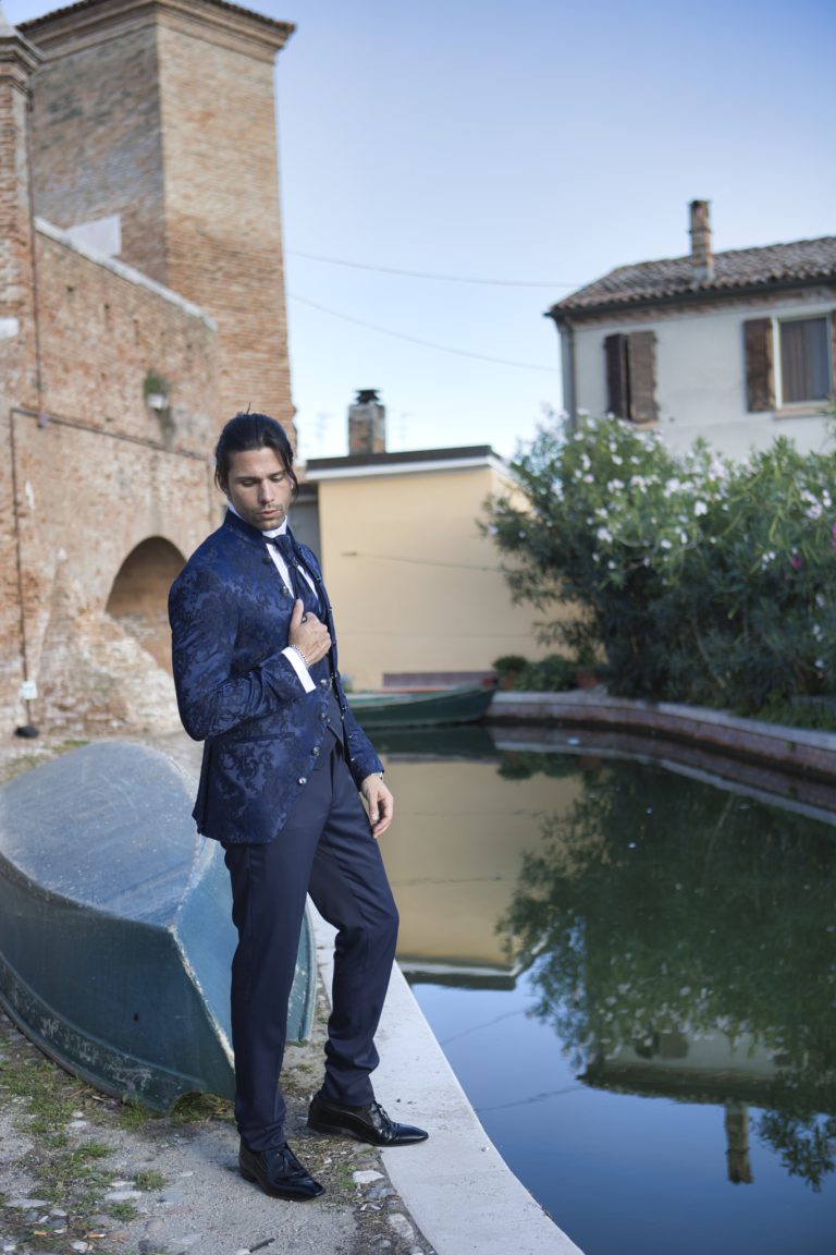 Scopri il modello Marco Aurelio, un abito da sposo con giacca coreana damascata, disponibile sia in blu che in nero.