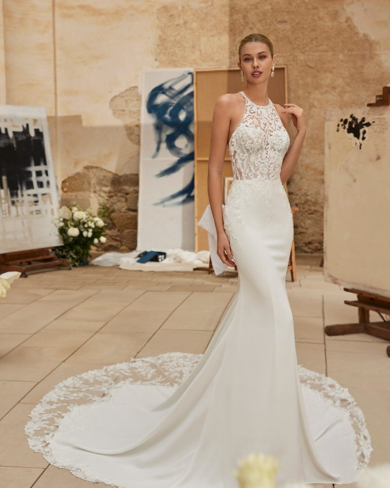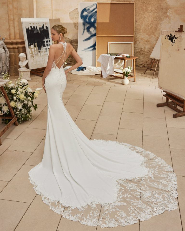 Meraviglioso abito da sposa a sirena, realizzato in crepe con corpino in pizzo e perline. Degno di nota lo scollo all’americana e le spalline incrociate sulla schiena.