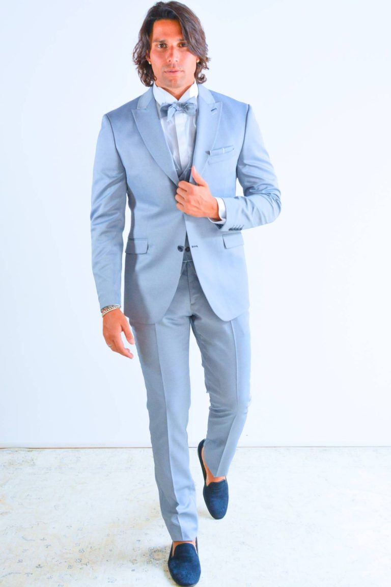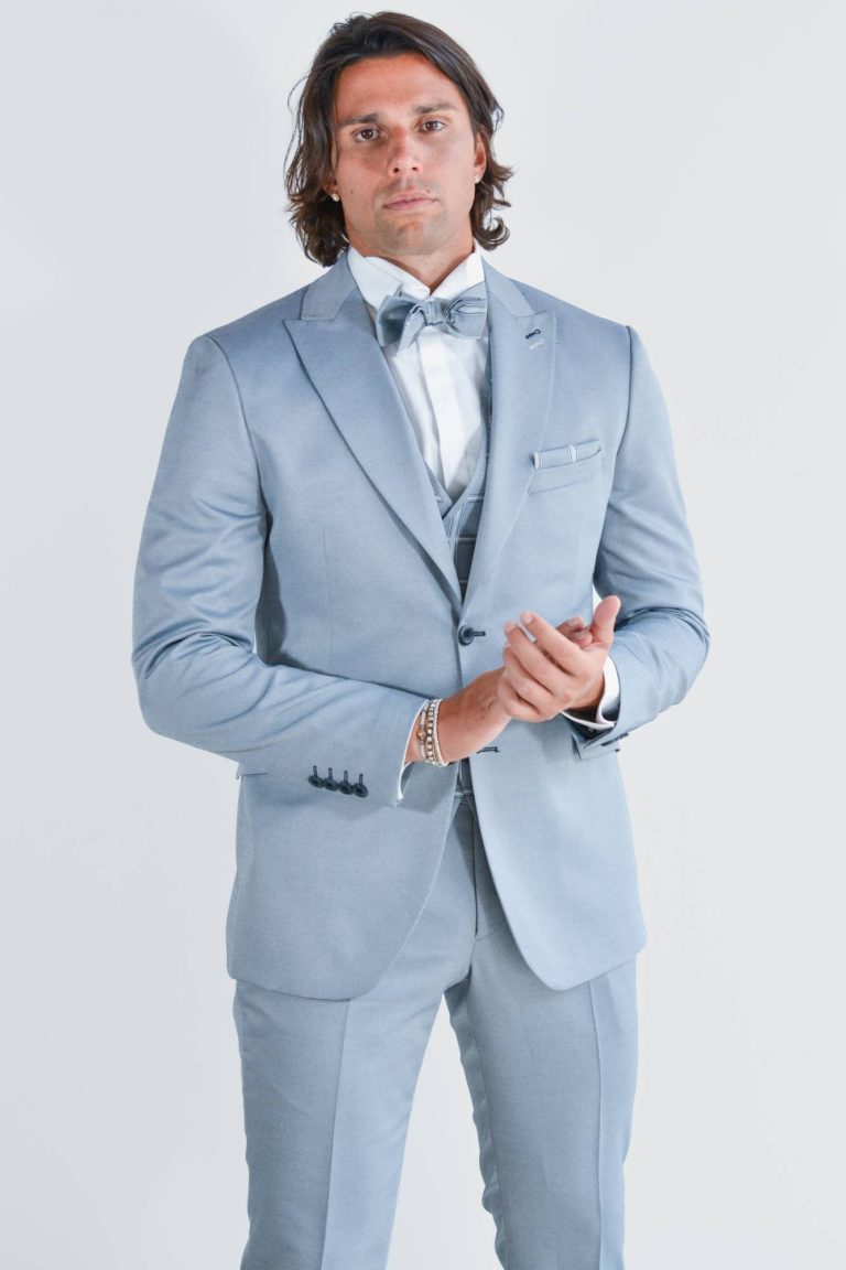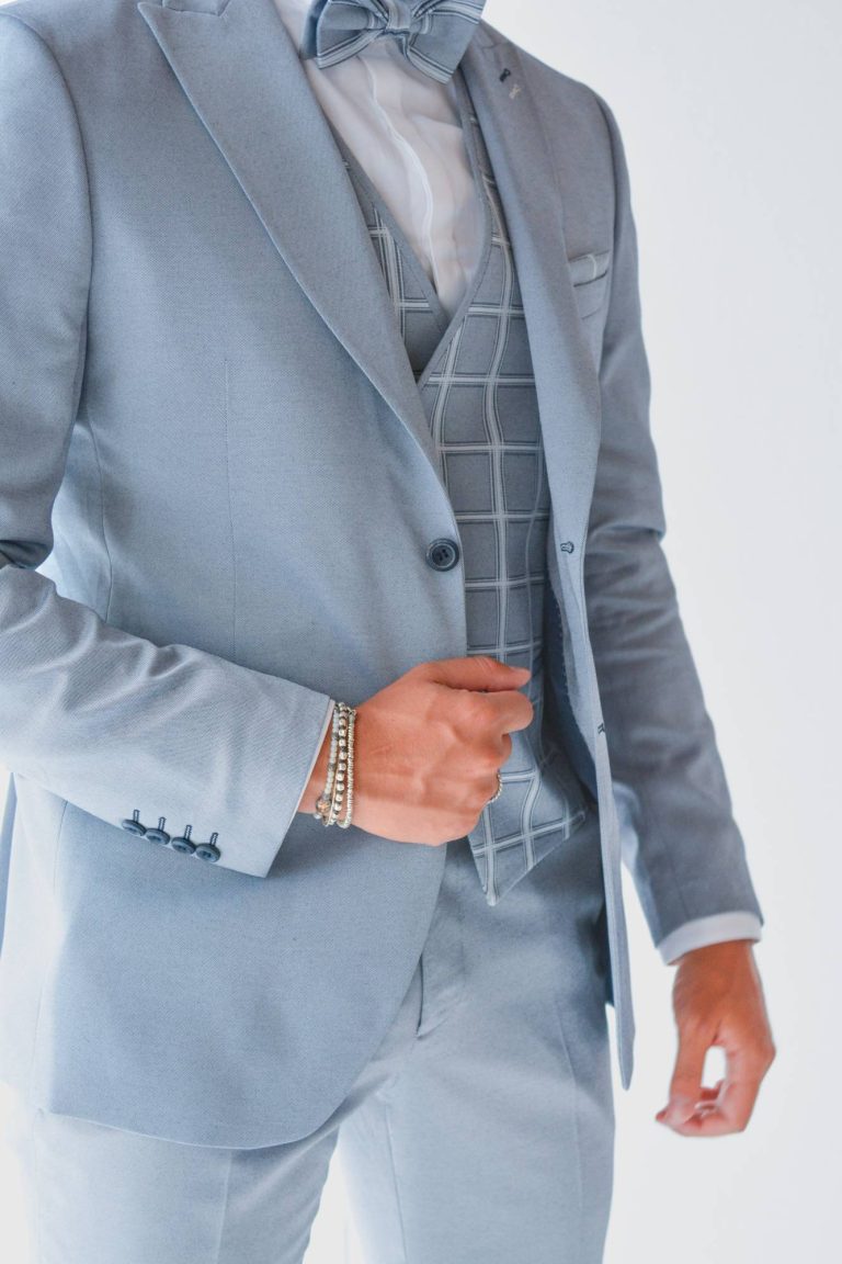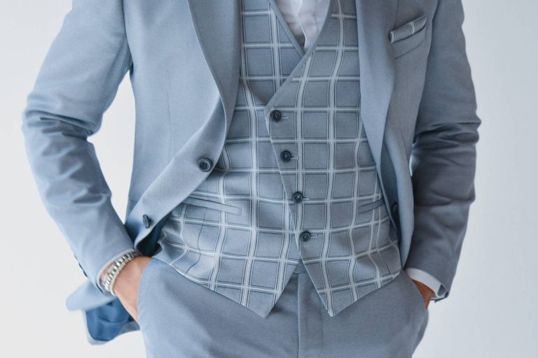 Abito da sposo cotonato, giovanile e versatile, degno di nota il gilet con fantasia finestrata.