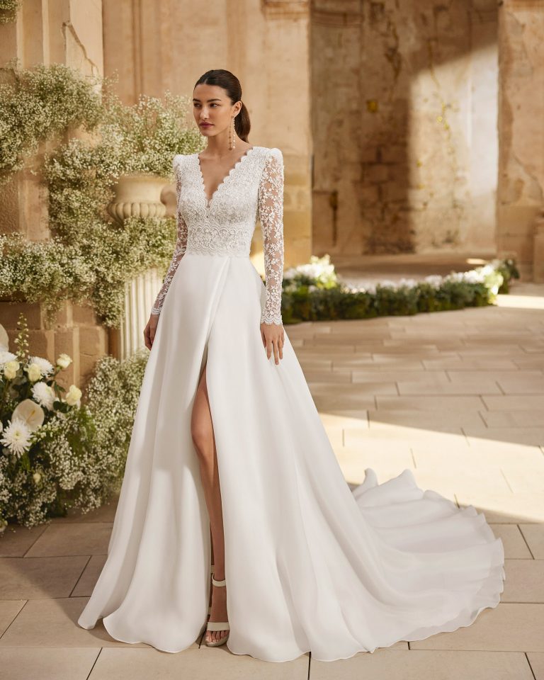 Michelle è un meraviglioso abito da sposa ampio caratterizzato da un elegante corpetto in pizzo ricamato e perline, con scollo a V e maniche lunghe. La schiena illusion e lo spacco laterale della gonna aggiungono un tocco contemporaneo e raffinato.