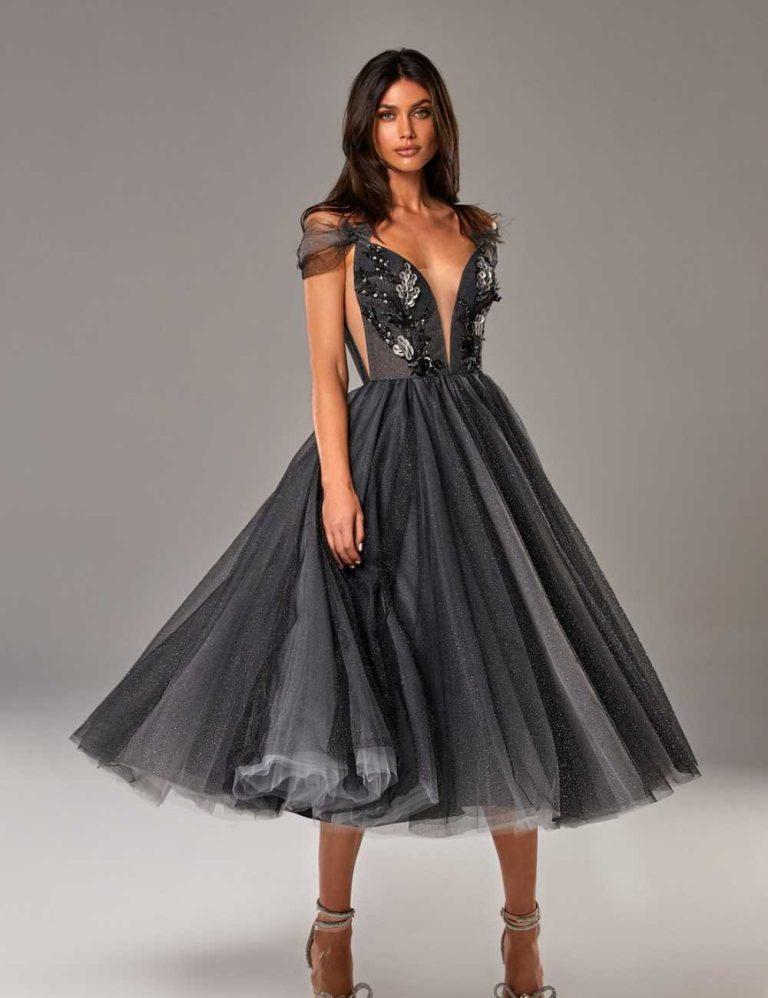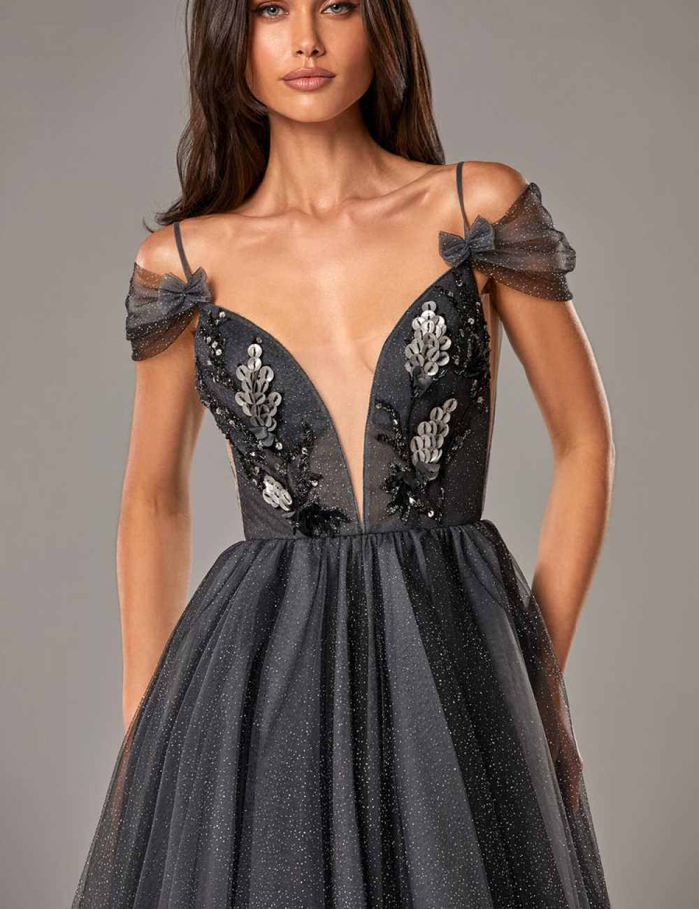 Abito da cerimonia nero con corpetto ricamato e profondo scollo a V. La gonna in tulle vaporoso dona movimento e charme a un look sensuale, elegante e fuori dagli schemi.