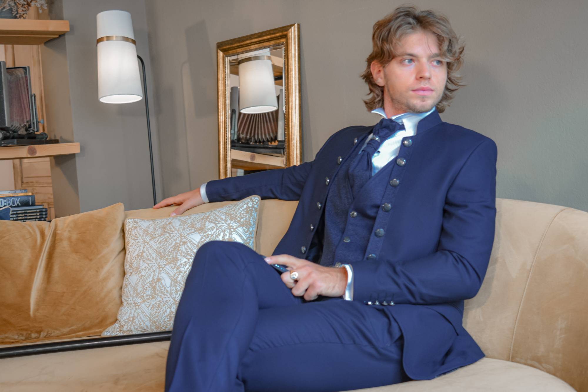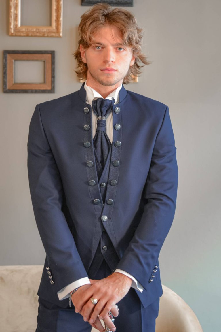 Coreana slim fit con profili in jacquard. Un abito da sposo alla moda e giovanile.