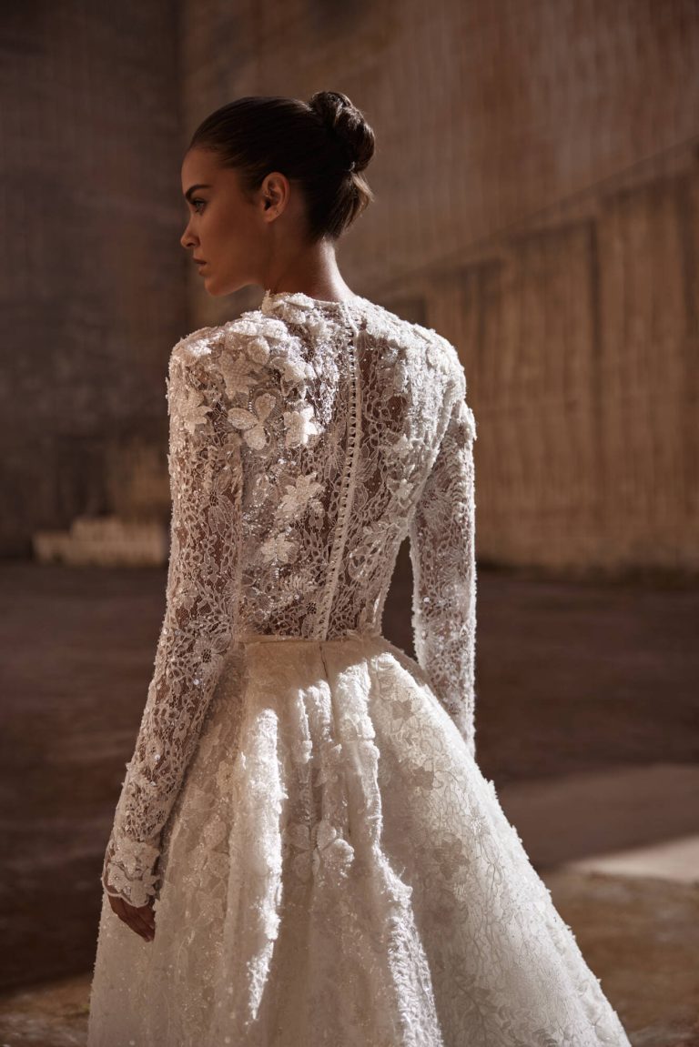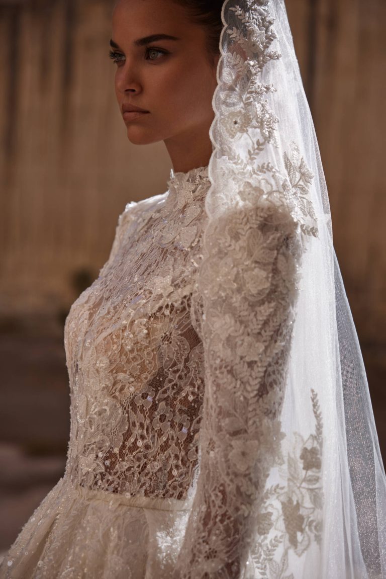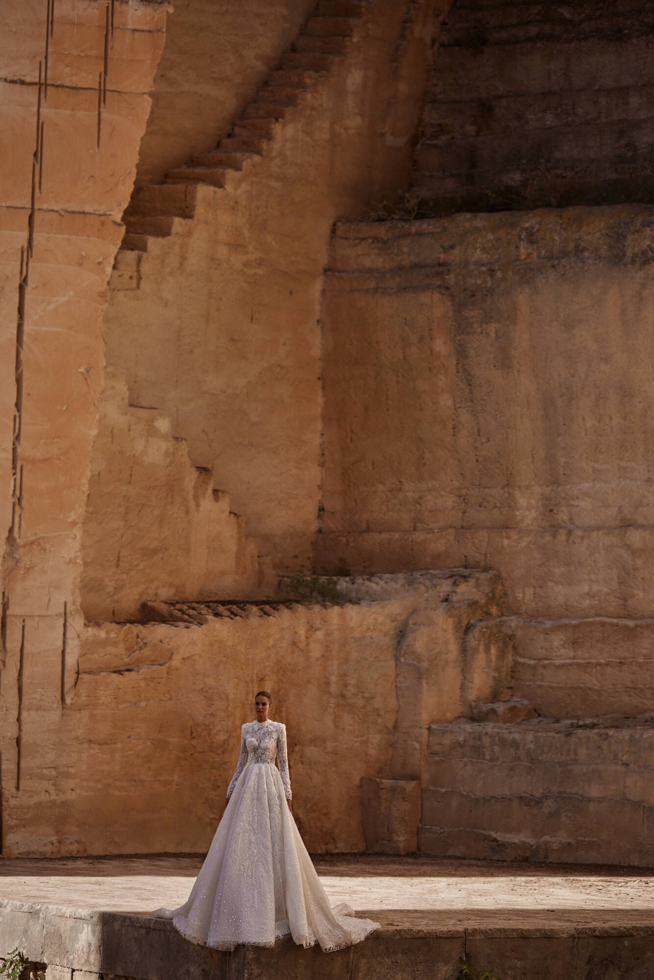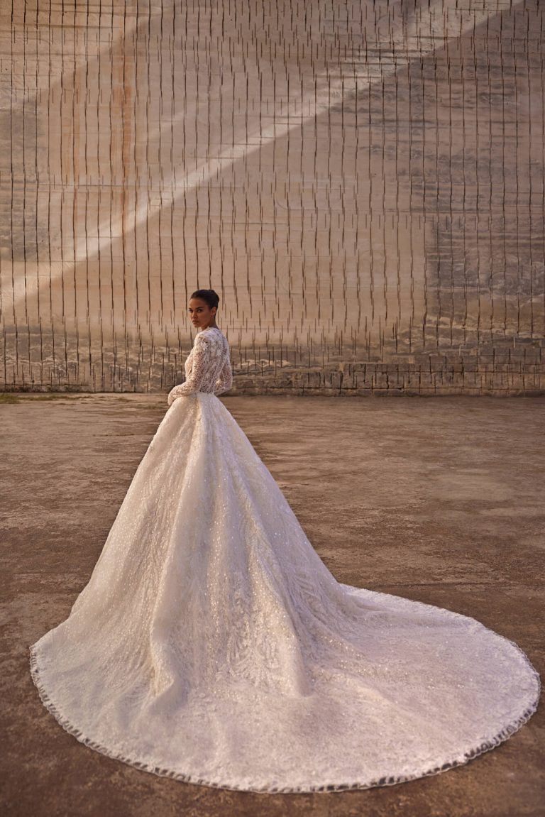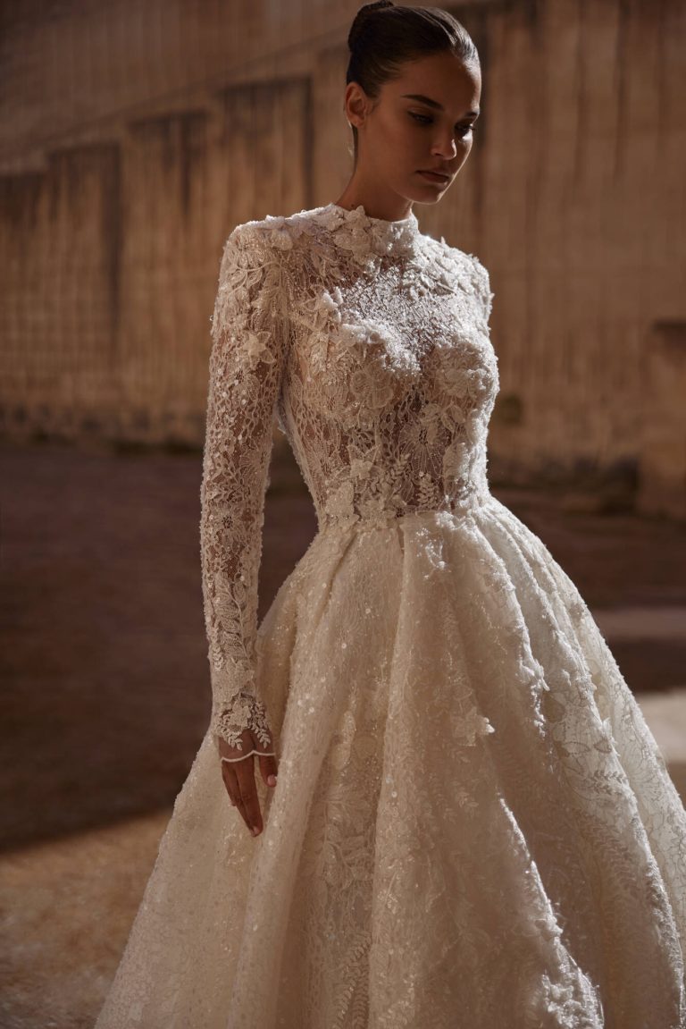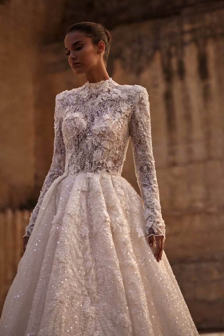 Monroe è un spettacolare abito da sposa a maniche lunghe realizzato in pizzo decorato. Caratterizzato da corpetto a collo alto, corsetto doppiato con un ulteriore corsetto modellante cucito, maniche lunghe in pizzo decorate con spalle quadrate, ricamate con strass, fiori 3D e corpetto con paillettes, e voluminosa gonna da principessa con lungo strascico.